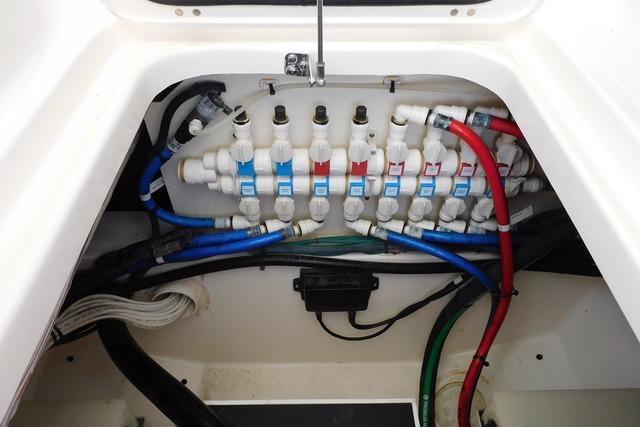 - Raw water pump with sea strainer, sea cock, and thru hull fitting fishbox evacuation pump with dedicated control valves