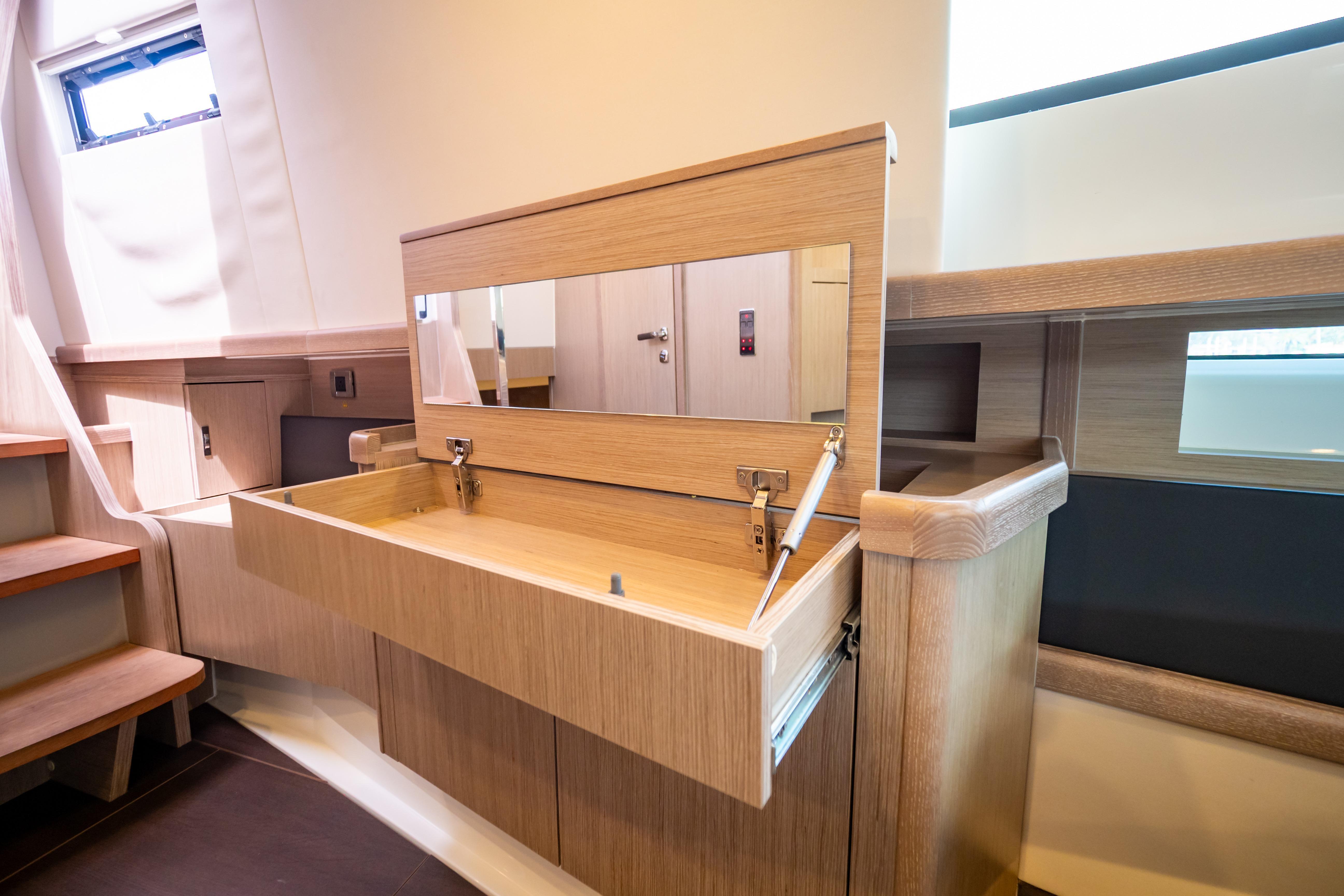 Interior furniture in high quality marine plywood, colour: warm mahogany (according to colour card).