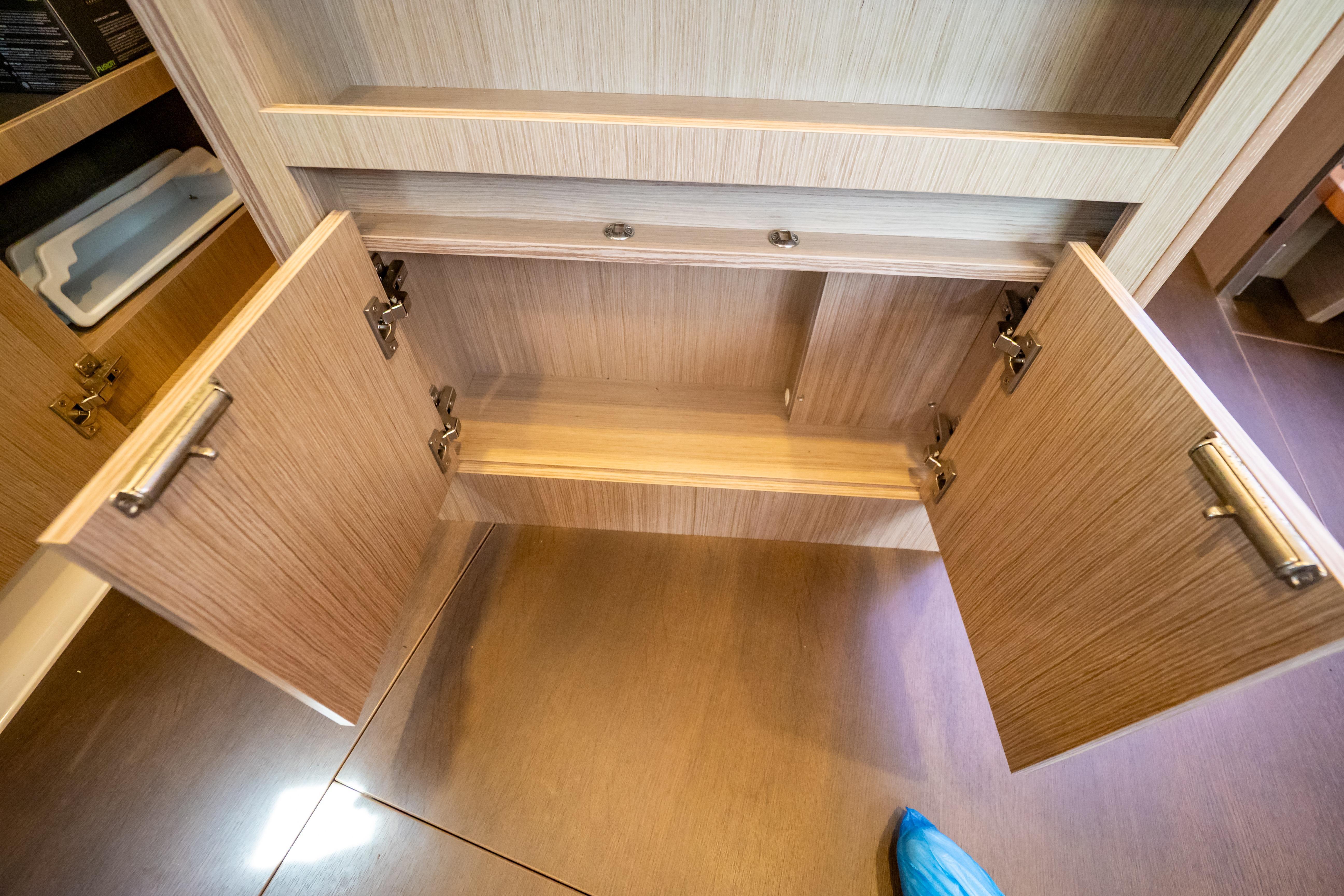 Galley, colour: signal white. With lockers and drawers, working top in marine mineral stone, folding mixing tap and fridge.