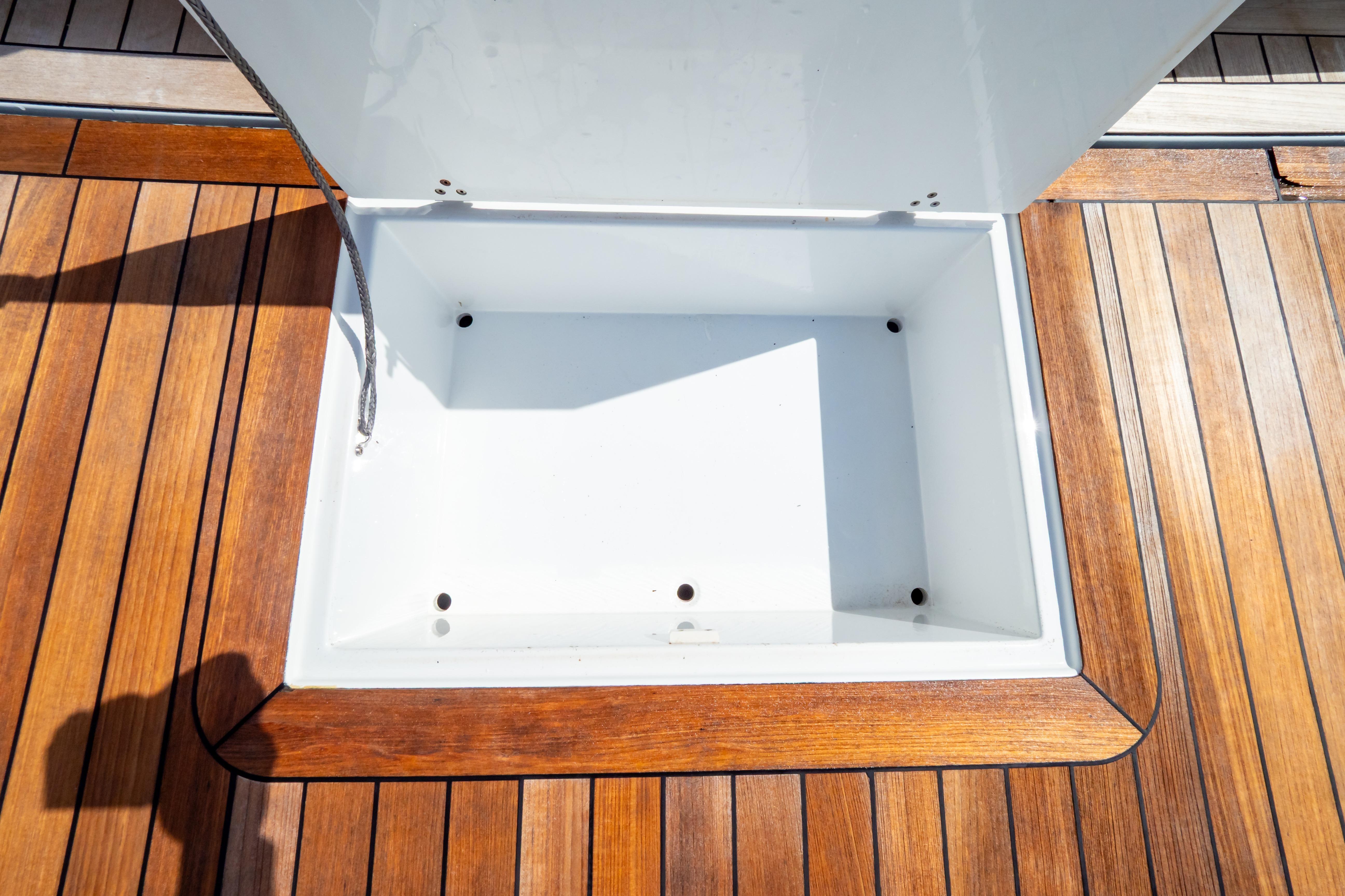 GRP deck, isophthalic gelcoat, colour: signal white (according to colour card), 1st layer vinyl ester resin. Vacuum infused. Deck covered with synthetic teak (according to colour card). Stainless steel tie bar for fender.
