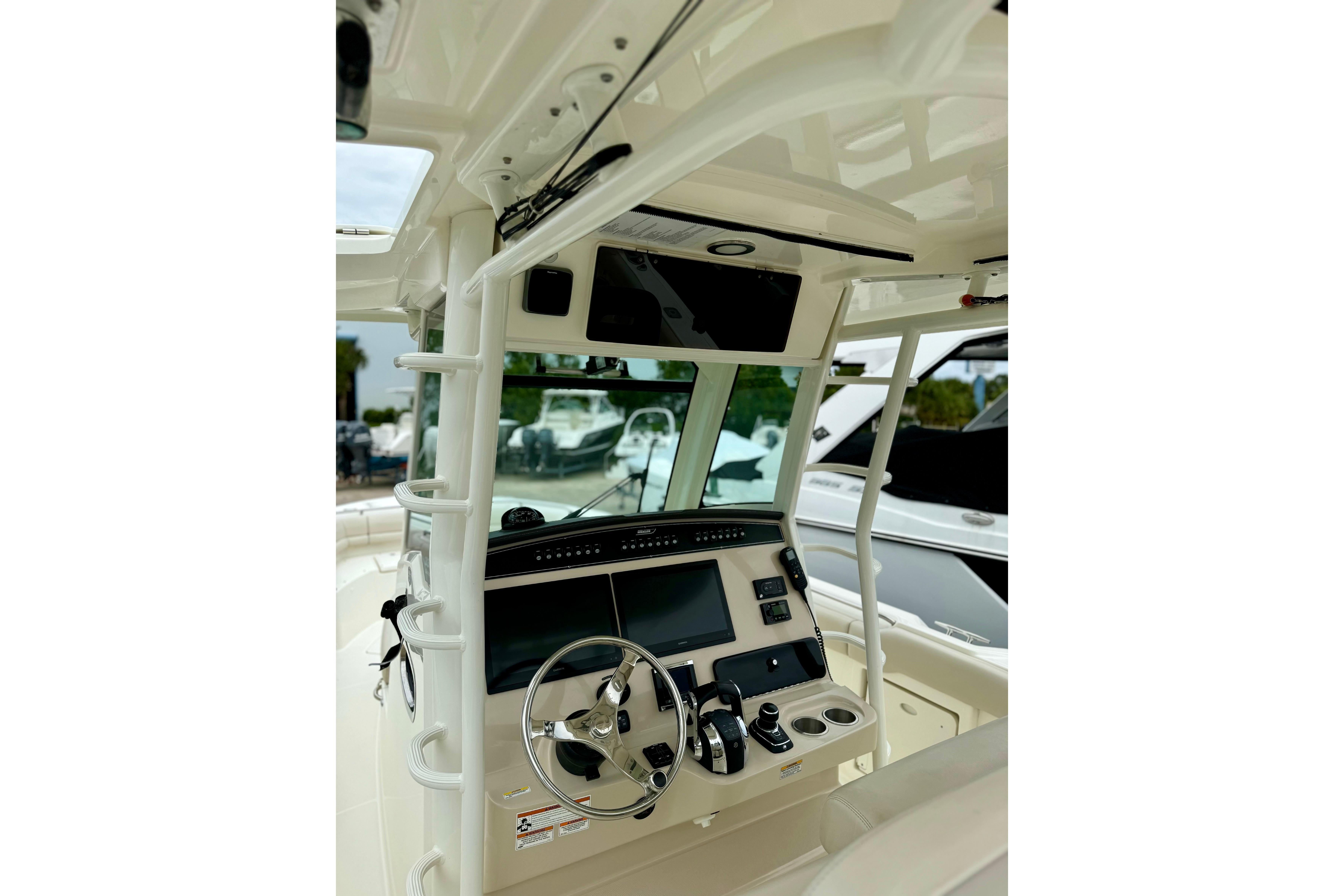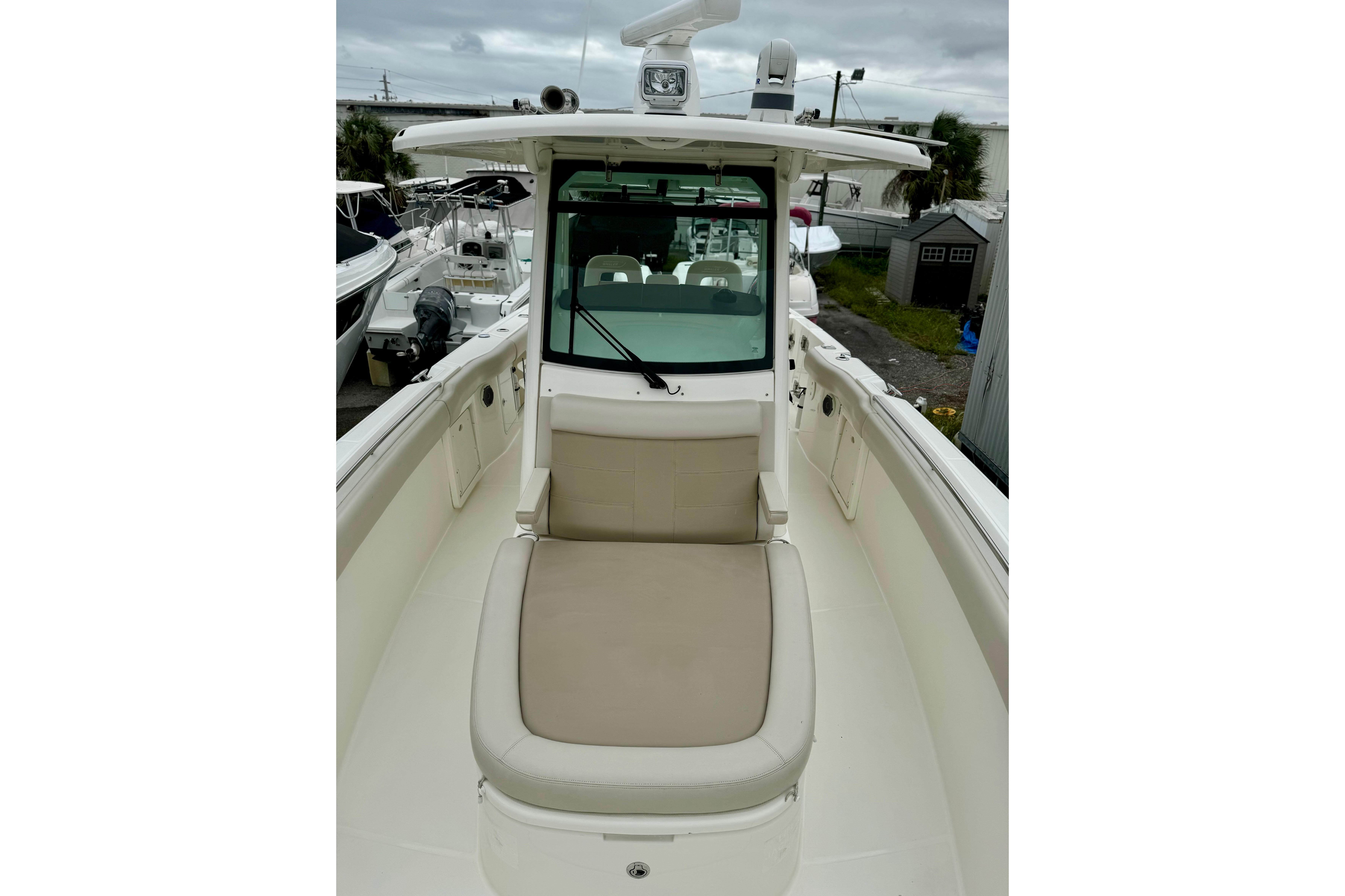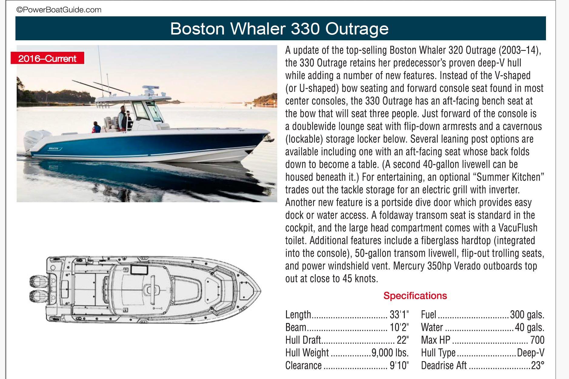 The all-new 330 Outrage is an outstanding saltwater performer, built on a foundation of core confidence. Boston Whaler’s precision-engineered design delivers a smooth, dry, comfortable ride—the optimal balance of stability and softness. Handling is beautifully predictable with seamless control, giving you ease and confidence like you’ve never felt before. Fishing features and options galore, including numerous comfort-minded amenities for you and your guests, make the 330 perfect for entertaining and whatever offshore adventures you dream up. Not only is this new Outrage up to the task, but it’s also designed to make every task a pleasure.Private enclosed head compartment in the console features a VacuFlush® toilet, porthole and storage space.Plus forward lounge seat with armrests opens to reveal a cavernous storage compartment.Access protection from midday rays with the optional bow sunshade.Enjoy ample fish-fighting room in the cockpit, courtesy of a wide beam and fold-away aft bench.Smart bow seating, a convenient dive door and optional bow and aft sunshades empower great entertaining.