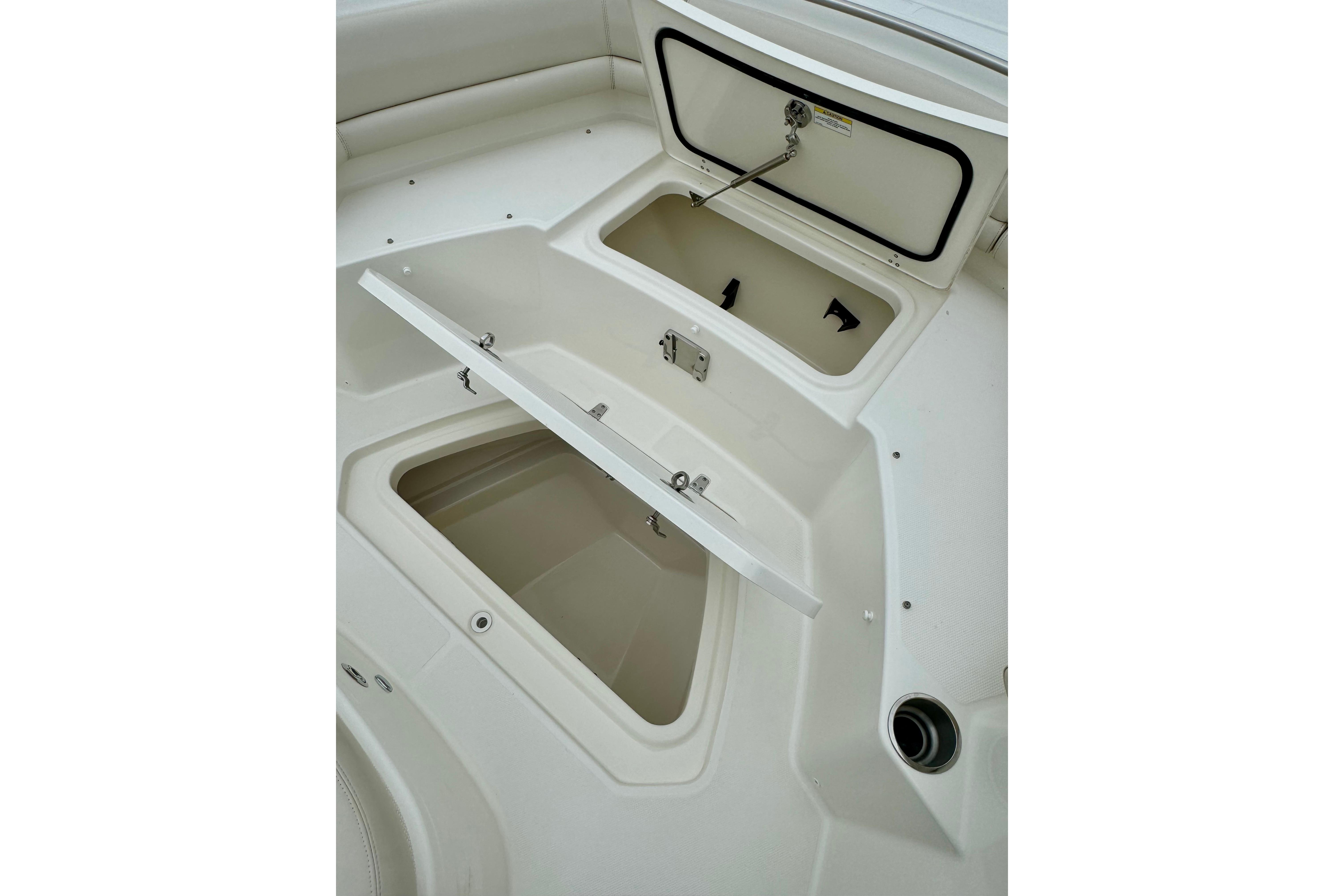 - Port aft storage at fishing prep area (can store a 5 gallon bucket)