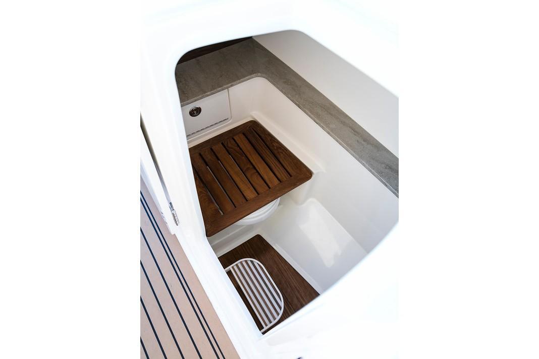 - Porcelain VacuFlush® toilet, holding tank, overboard discharge, and dockside pump-out
