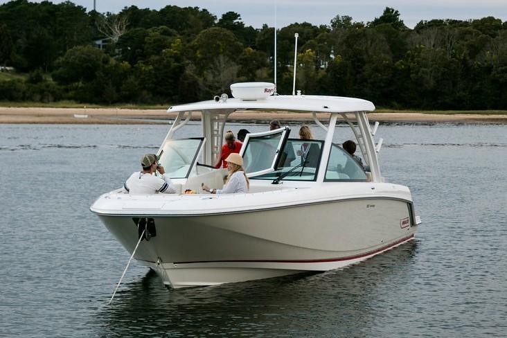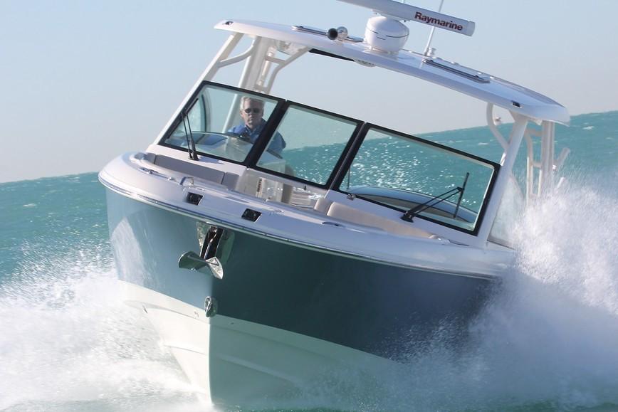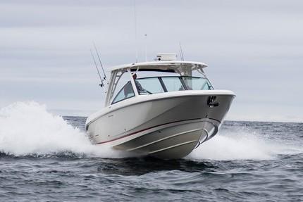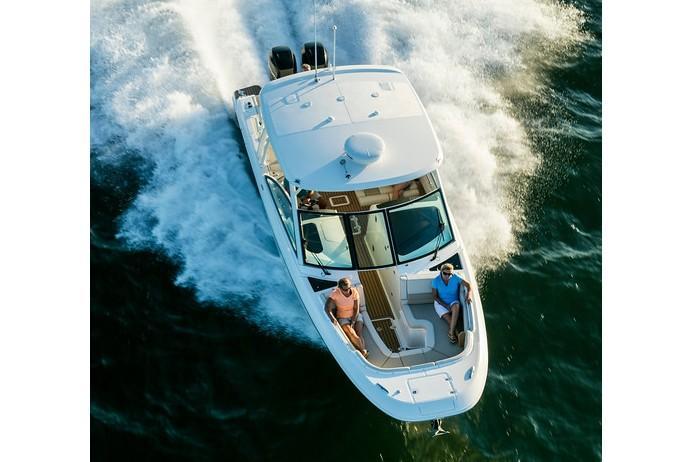 Cutting-edge features, great capacity and easy adaptability are hallmarks of the dual-console 320 Vantage®, winner of the National Marine Manufacturers Association’s 2015 Innovation Award. Rock-solid control meets the ultimate in versatility and comfort with the many accessories and options the 320 provides. Serious fishing, joyful entertaining, day-long watersports or cruising and even a place to sneak in a nap or an overnight stay–the 320 is ready for your day. When the softest, safest ride meets the best equipped dual-console around, new possibilities become eminently possible.Uniquely convertible portside seating offers an array of configurations.Spacious open bow features backrests, a large under-seat cooler, an optional bow table and more.A cockpit utility center includes a sink, 18-gallon cooler and prep surface, plus optional grill and fridge.Below deck, a cozy interior seating area offers a break from the weather.Two touchscreens at the helm feature available Raymarine® electronics and VesselView display.