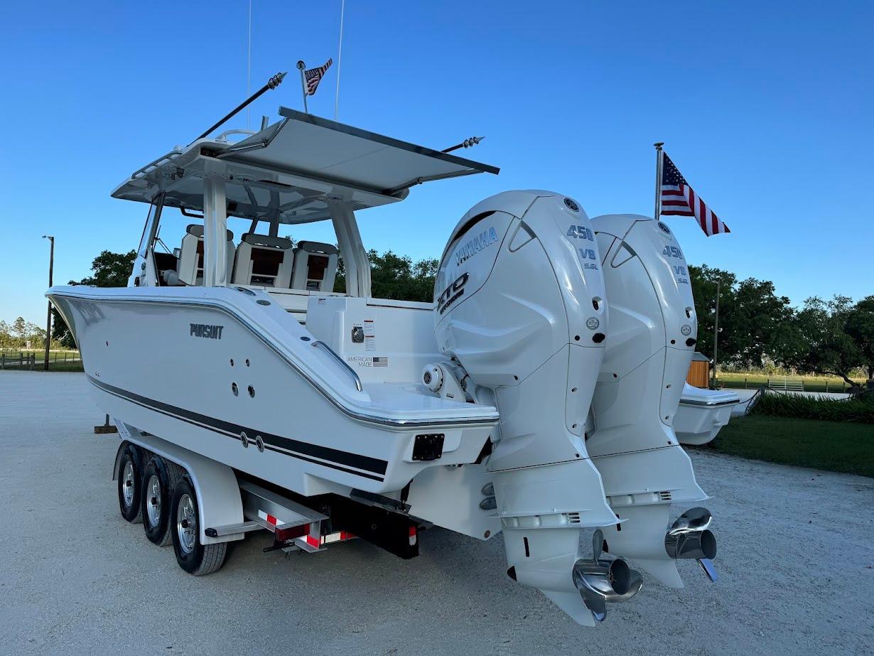 LESS THAN 100HRS ON 450 YAMAHAS WITH 7 YEAR EXTENDED WARRANTIES!!!!2024 S358 Pursuit with only 92hrs on twin 450 Yamahas!!!!SeakeeperGeneratorFull Covers7 year extended warrantiesLoaded with options!!!Trailer is extra if needed!! Designed to catch your eye and make it easy to haul in the perfect catch, the all-new S 358 is our first-ever 35' center console. Not only are you getting a boat that has best-in-class amenities, you’re getting a boat in the highly coveted Pursuit Sport family. Pivotal to its purpose is functional versatility. Like the split mezzanine seat that folds out of the way to access the entertainment center amenities.Ergonomically designed helm seating and dash for the ultimate in comfort and control. And the fact that it’s the only center console in the 34' to 35' market to have an enclosed head. Whether you are socializing on deck, driving to your secret fishing spot or taking a moment to yourself, you’ll appreciate the thoughtful craftsmanship instilled in every inch. Plus, forward-facing lounge seats in the bow, side coaming storage and built-in rod holders add to the ways you and your family can enjoy this boat.And in true Pursuit design tradition, nothing has been overlooked. Even down to the details, flexibility and resourcefulness make the S 358 the real standout. Competitively speaking, it has the largest cabin and the most aft cockpit seating and social zone configurations. Personally, this gives you the freedom to adjust these ample spaces to maximize your time on the water.