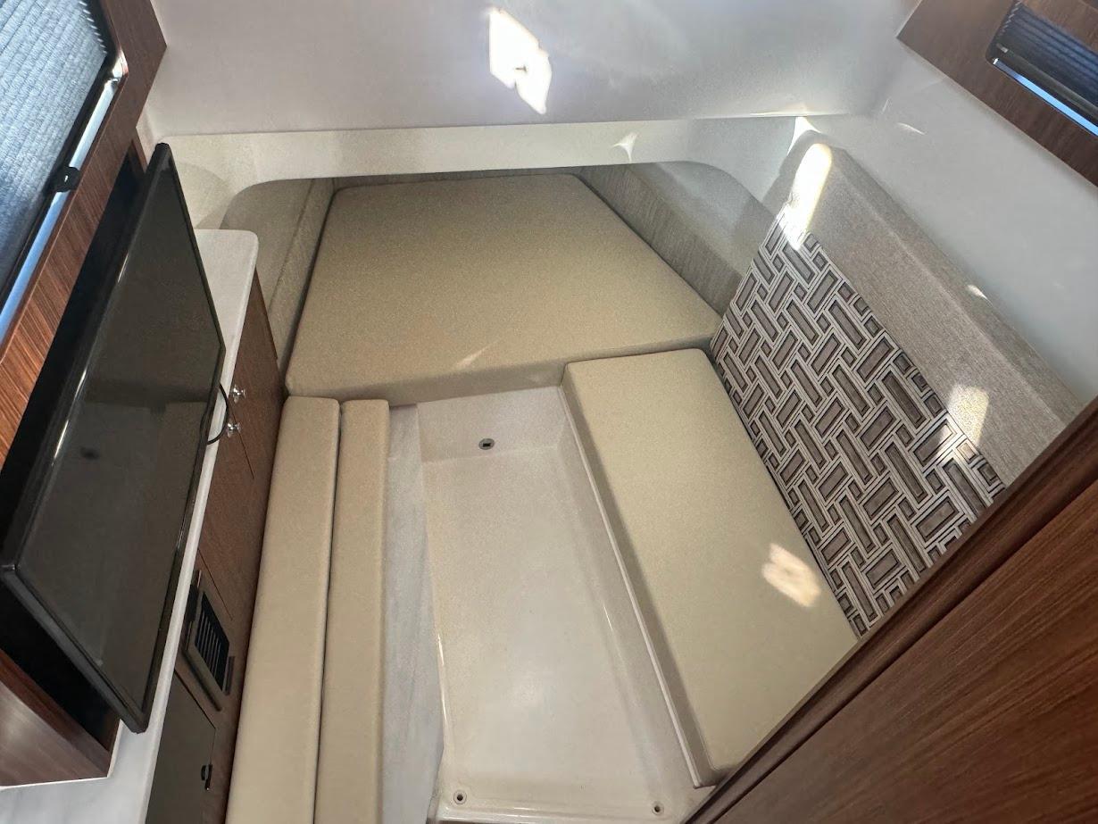 - Molded Forward Port & Starboard Bow Seating with Electrically Actuated Forward-Facing Backrests, 12V & USB Charger, and Insulated Storage Below