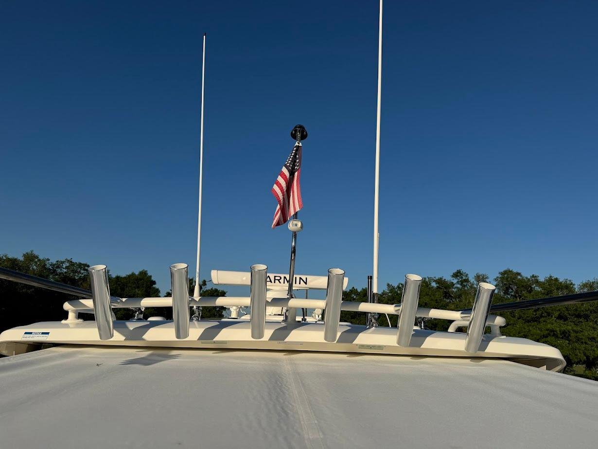 - Molded Fiberglass Full Beam Hardtop with Custom Sliding Access/Ventilation Hatch, Integral Grab Rails, Overhead Electronics Mounting Surface, Life Vest Storage, and Dedicated Locations for Outriggers and Electronics