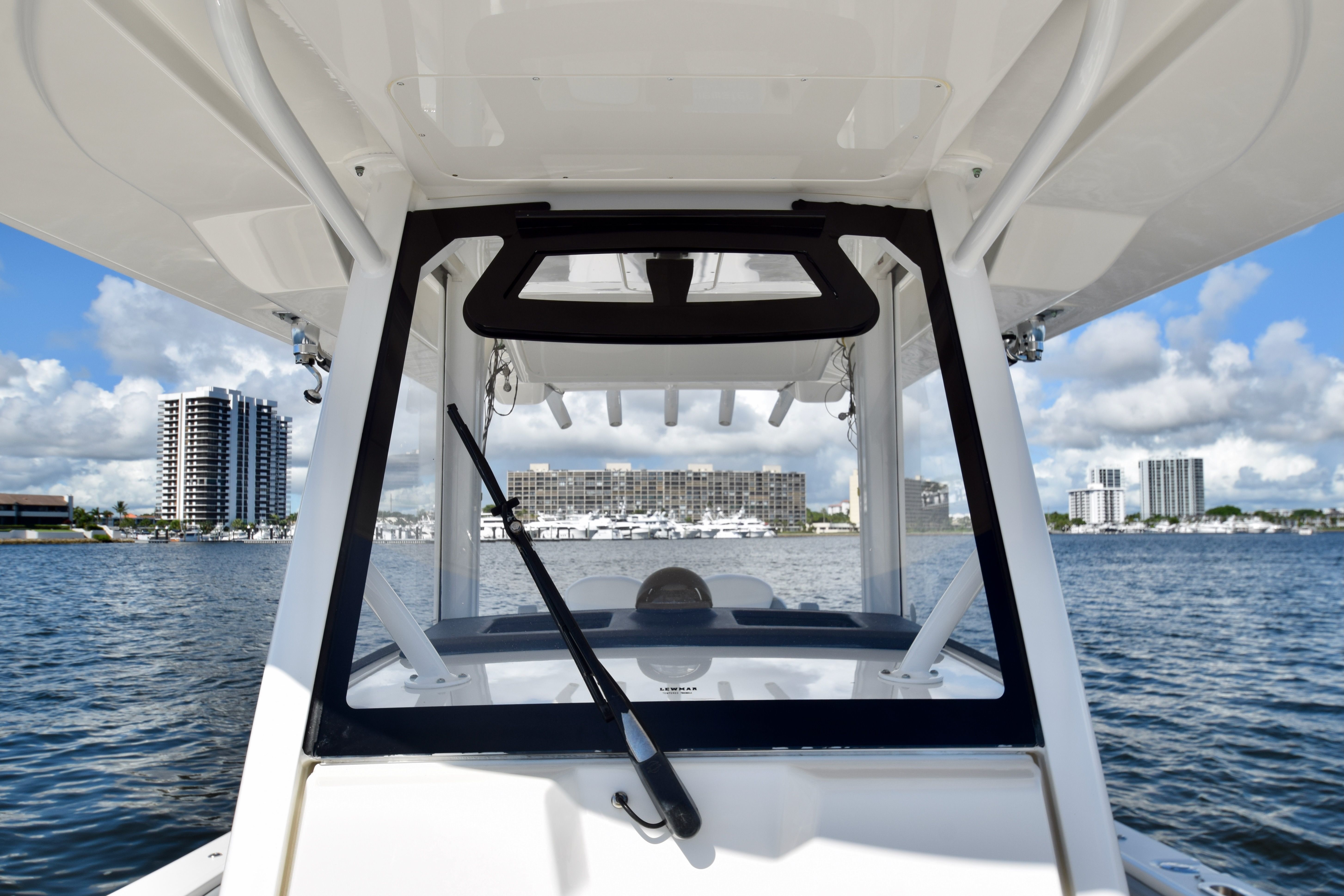 - Fiberglass T-Top with Surfboard Edges, Electronics Box, Navigation/Dock Lighting, Spreader Lights, and Multi-Colored LED Lights – Complete with Integrated Wraparound Windshield with Vent and Windshield Wiper/Washer