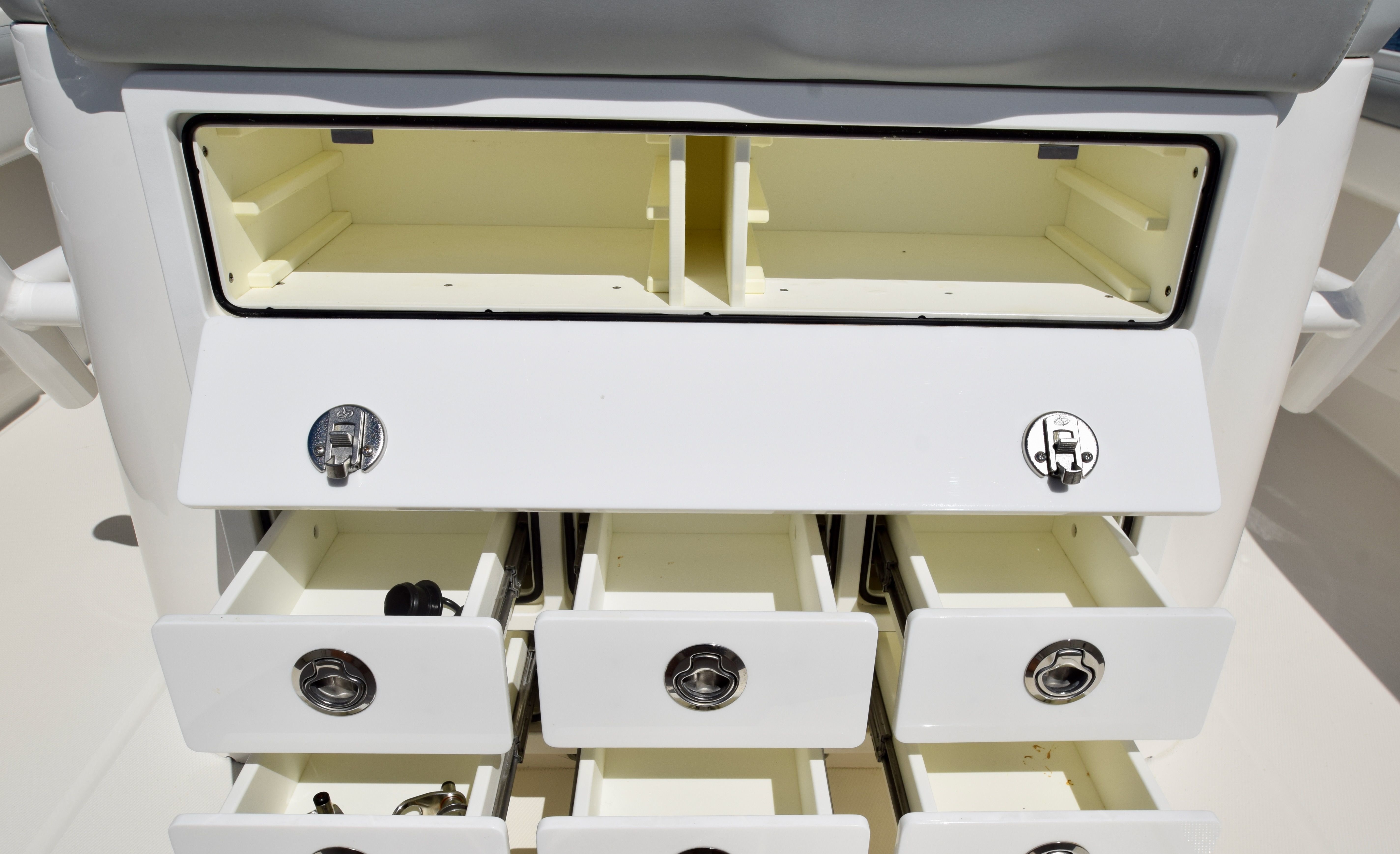 - Seatback with Cup Holders and Rocket Launcher; (6) Medium Plano Trays; and (2) Tackle Drawers in Cabinet
