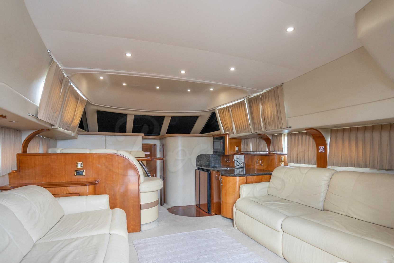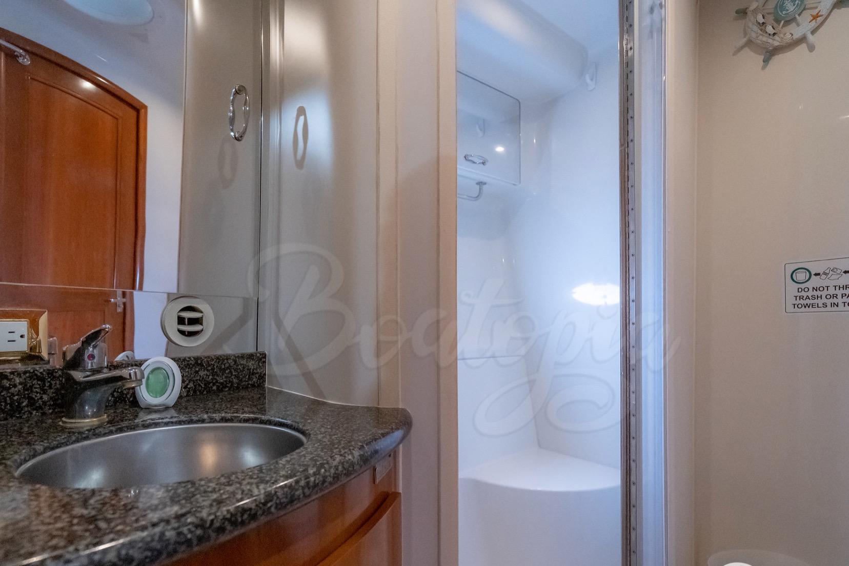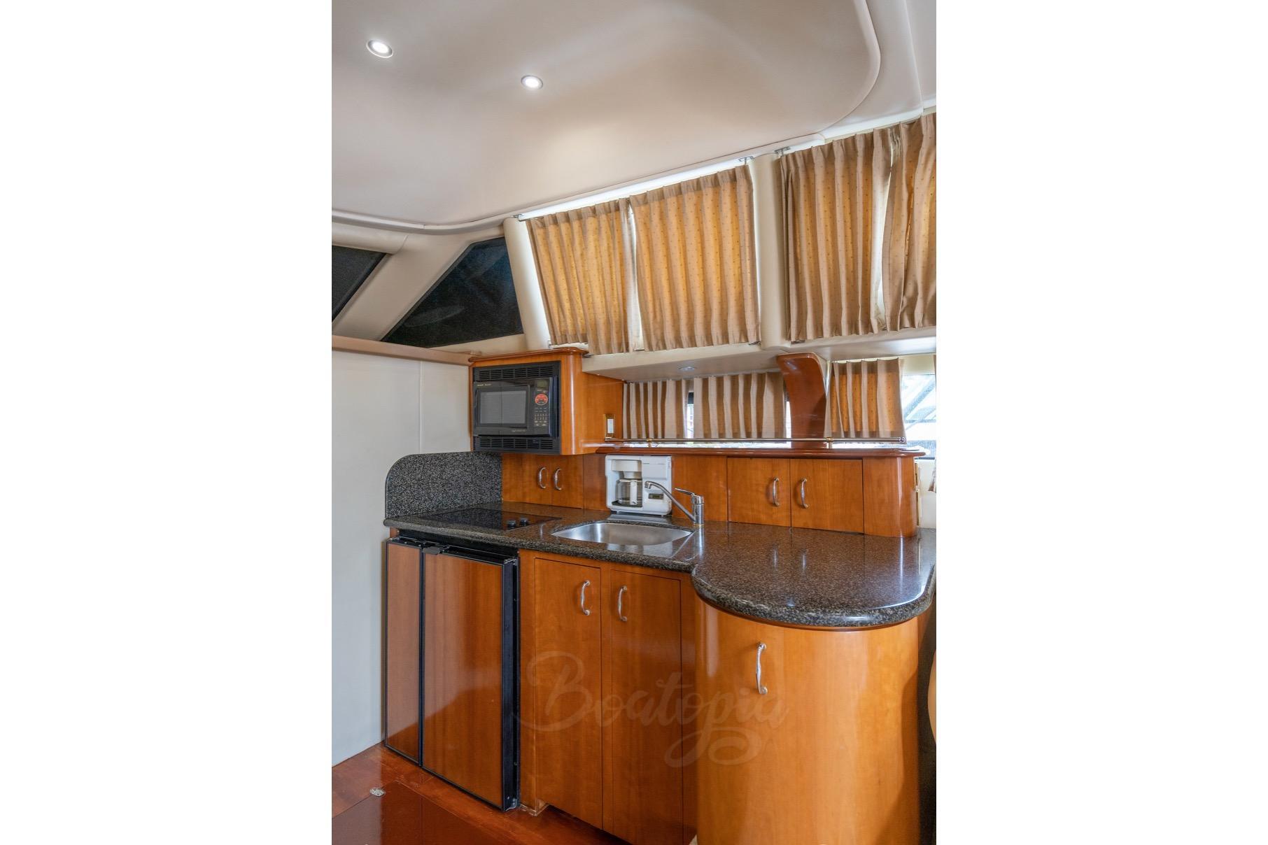 EquipmentPower & Systems • Twin Volvo Penta 8.1 Gi Engines | ~2,300 hrs • Kohler 10 kW Generator w/ Sound Shield | ~1,200 hrs (verify) • 50A Shore Power Service | 50A Cord + Adapters • Multi-Bank Battery Charger • Bow Thruster • Trim TabsHelm & Navigation • Flybridge Helm w/ Full Instrumentation • Raymarine RL70 Radar/Chartplotter • Raymarine Autopilot • Raymarine ST-60 Depth Finder • VHF Marine Radio • Compass | Spotlight | Windshield WipersTankage & Capacities • Fuel: 400 gal (twin saddle tanks) • Fresh Water: 95 gal • Holding Tank: 35–50 gal w/ Pumpout • 3-Zone Marine Air Conditioning & Heat • Hot Water Heater (11 gal) • VacuFlush Head | Tank MonitorDeck & Exterior • Integrated Swim Platform w/ Ladder & Transom Door • Windlass w/ Anchor, Rode & Chain • Foredeck Sun Pads • Molded Stairways Port & Starboard to Flybridge • Stainless Steel Rails & Cleats • Cockpit w/ Lazarette & Storage Lockers • Full Flybridge Enclosure (isinglass/strataglass panels) • Deluxe XL Flybridge Seating w/ Double Helm Seat & Wrap-Around Lounge • Flybridge Wet Bar w/ Refrigerator • Bridge Stereo & SpeakersInterior & Galley • Expansive Full-Beam Salon w/ Sofa & Large Windows • Raised Dinette (seats 4–6) • Entertainment Center (TV, Stereo, DVD – upgraded flat screen possible) • Galley w/ Corian Counters | Double Sink | Convection Microwave | 3-Burner Electric Cooktop | Full-Size Refrigerator/Freezer • Master Stateroom Forward w/ Centerline Queen Berth | Hanging Lockers | Drawer Storage • Guest Stateroom w/ Twin Berths (convertible to Queen) • Large Head w/ Separate Stall Shower • Central Vacuum System • Premium Cabinetry & CarpetingUtility & Comfort • Transom Shower (Hot/Cold) • Fresh & Raw Water Washdowns • Multiple Storage Lockers (under-seat & under-floor) • Full Wrap-Around Coaming Bolsters • Generator-Powered A/C for Salon & Staterooms