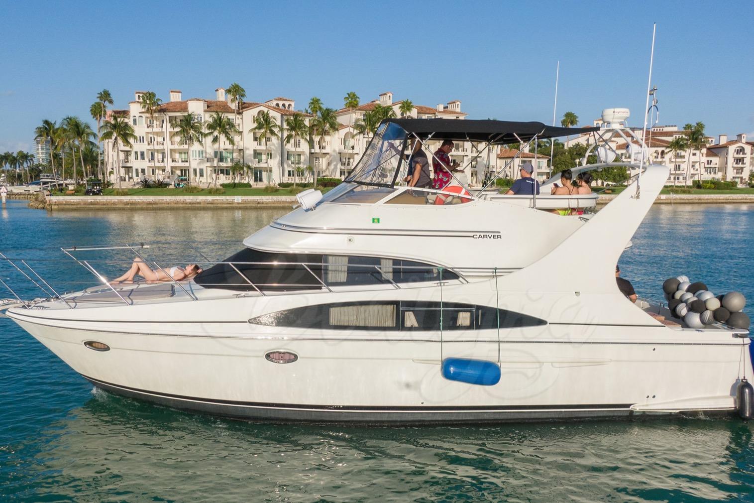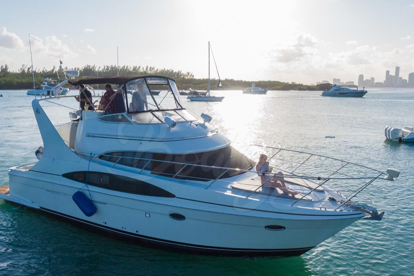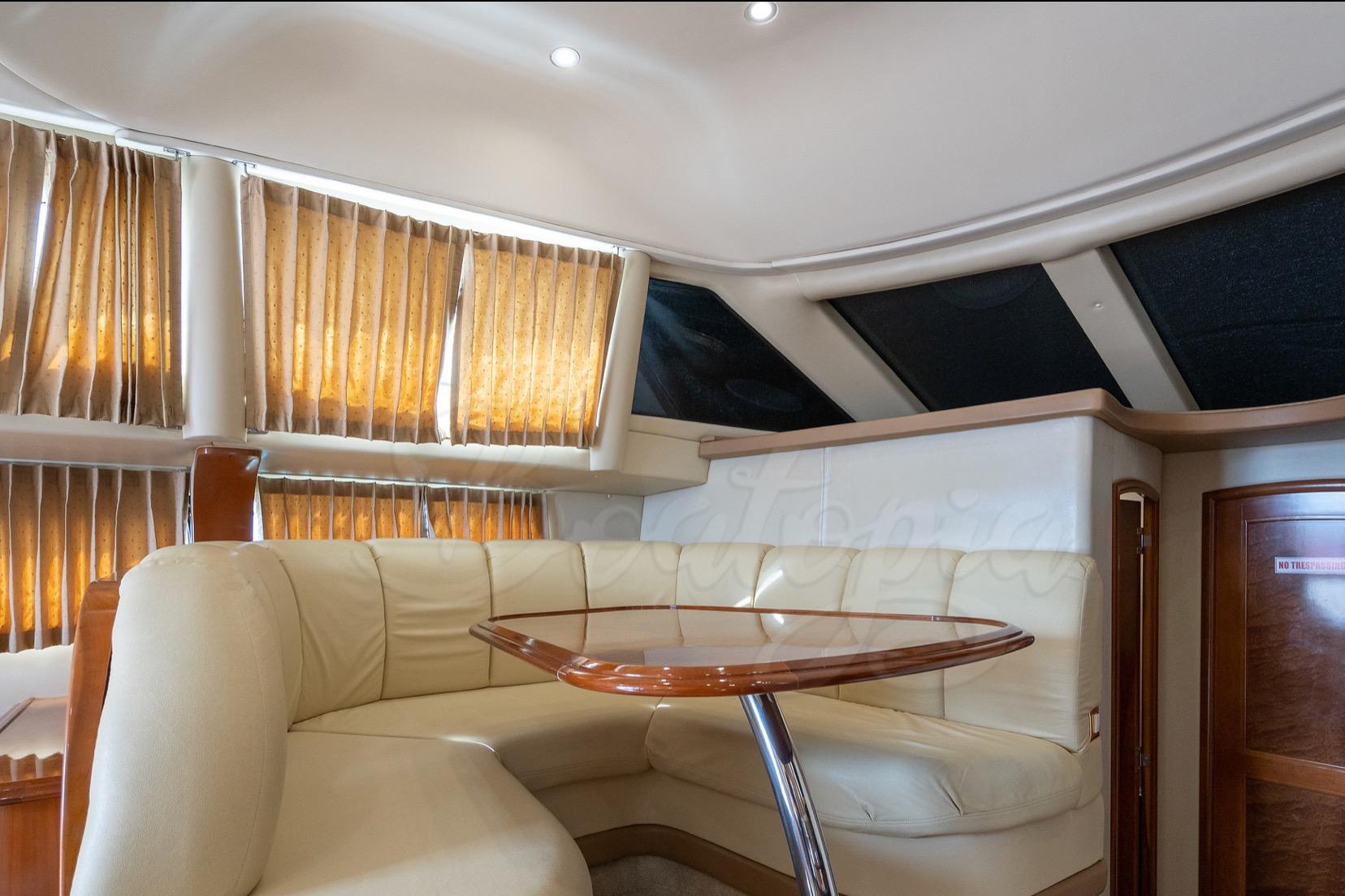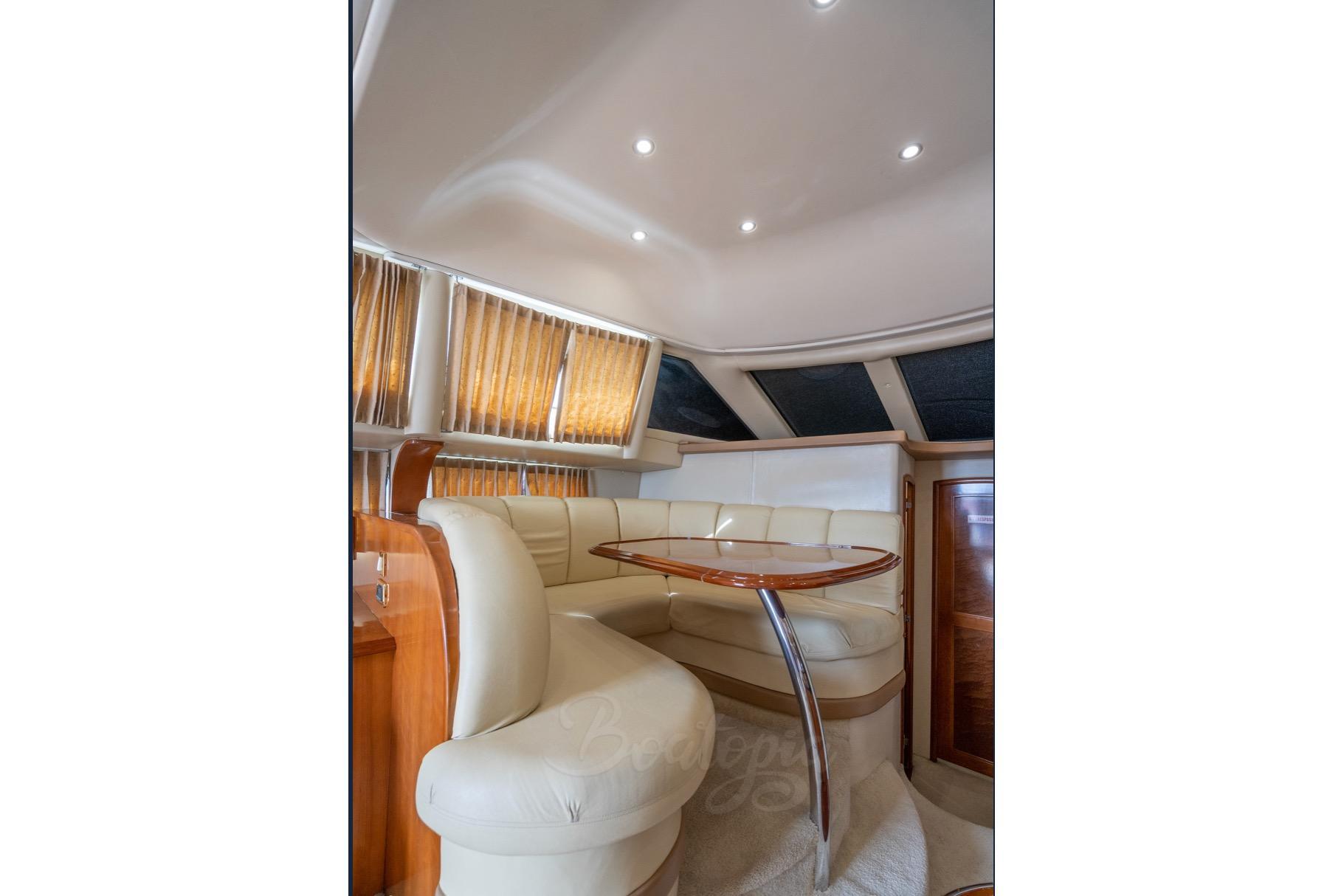 EquipmentPower & Systems • Twin Volvo Penta 8.1 Gi Engines | ~2,300 hrs • Kohler 10 kW Generator w/ Sound Shield | ~1,200 hrs (verify) • 50A Shore Power Service | 50A Cord + Adapters • Multi-Bank Battery Charger • Bow Thruster • Trim TabsHelm & Navigation • Flybridge Helm w/ Full Instrumentation • Raymarine RL70 Radar/Chartplotter • Raymarine Autopilot • Raymarine ST-60 Depth Finder • VHF Marine Radio • Compass | Spotlight | Windshield WipersTankage & Capacities • Fuel: 400 gal (twin saddle tanks) • Fresh Water: 95 gal • Holding Tank: 35–50 gal w/ Pumpout • 3-Zone Marine Air Conditioning & Heat • Hot Water Heater (11 gal) • VacuFlush Head | Tank MonitorDeck & Exterior • Integrated Swim Platform w/ Ladder & Transom Door • Windlass w/ Anchor, Rode & Chain • Foredeck Sun Pads • Molded Stairways Port & Starboard to Flybridge • Stainless Steel Rails & Cleats • Cockpit w/ Lazarette & Storage Lockers • Full Flybridge Enclosure (isinglass/strataglass panels) • Deluxe XL Flybridge Seating w/ Double Helm Seat & Wrap-Around Lounge • Flybridge Wet Bar w/ Refrigerator • Bridge Stereo & SpeakersInterior & Galley • Expansive Full-Beam Salon w/ Sofa & Large Windows • Raised Dinette (seats 4–6) • Entertainment Center (TV, Stereo, DVD – upgraded flat screen possible) • Galley w/ Corian Counters | Double Sink | Convection Microwave | 3-Burner Electric Cooktop | Full-Size Refrigerator/Freezer • Master Stateroom Forward w/ Centerline Queen Berth | Hanging Lockers | Drawer Storage • Guest Stateroom w/ Twin Berths (convertible to Queen) • Large Head w/ Separate Stall Shower • Central Vacuum System • Premium Cabinetry & CarpetingUtility & Comfort • Transom Shower (Hot/Cold) • Fresh & Raw Water Washdowns • Multiple Storage Lockers (under-seat & under-floor) • Full Wrap-Around Coaming Bolsters • Generator-Powered A/C for Salon & Staterooms