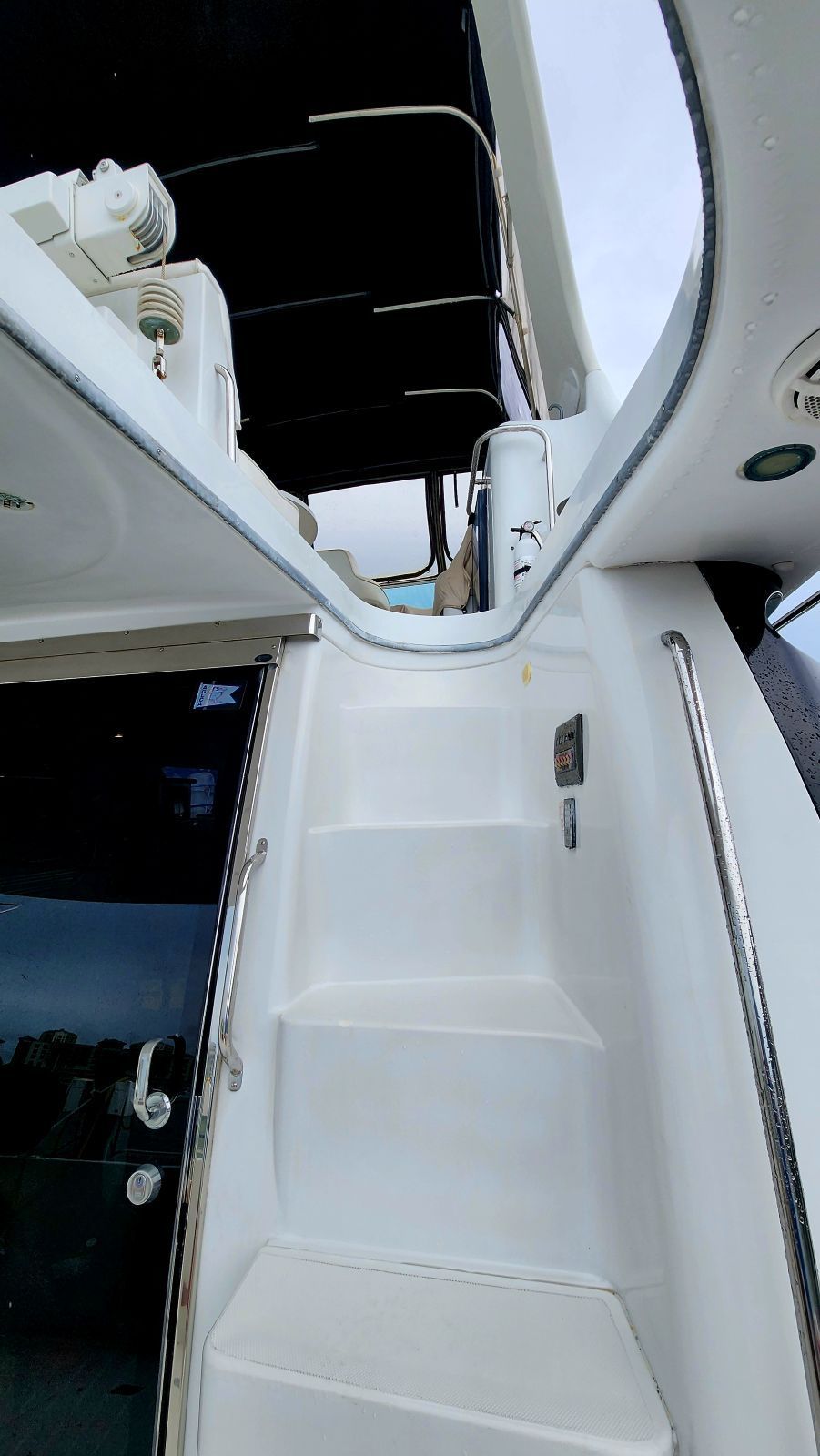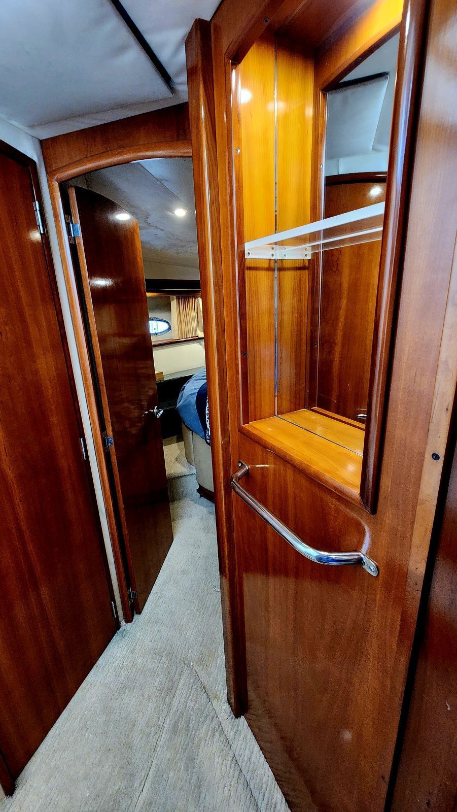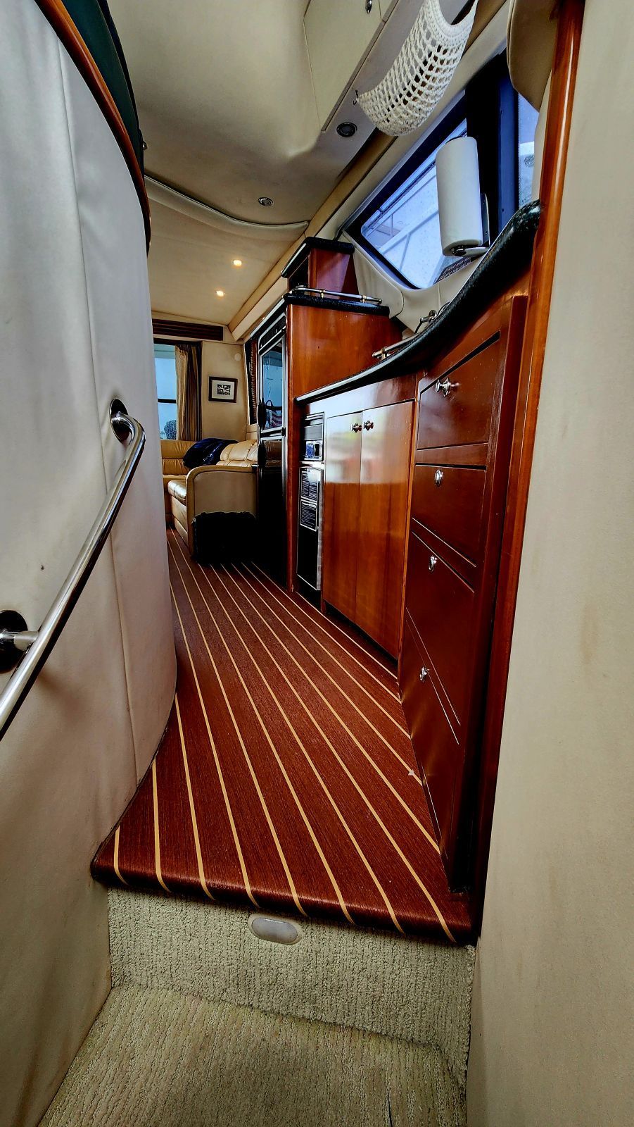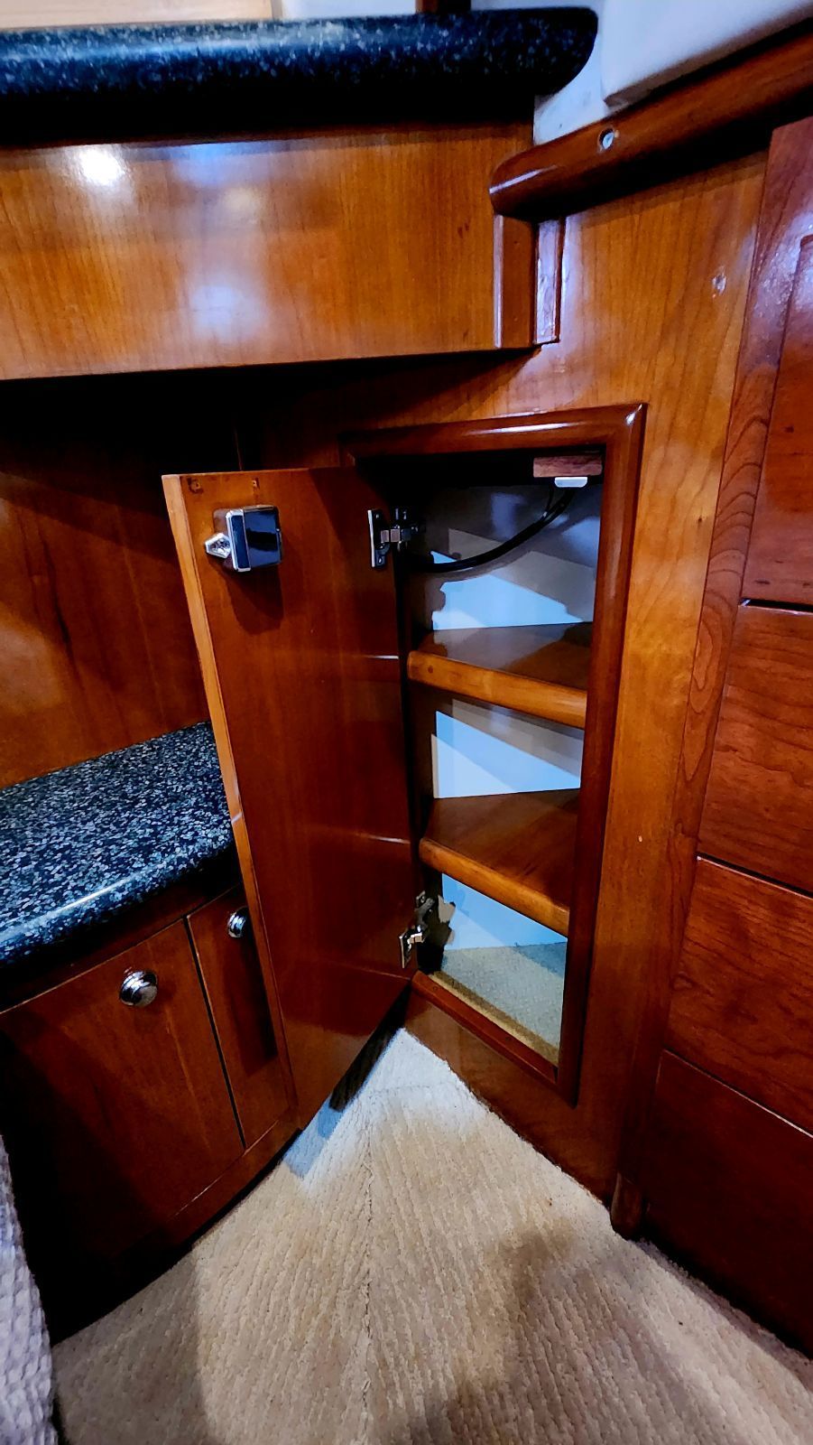 Forward to port, Still Waters’ galley has been thoughtfully updated for practical cruising. The gorgeous teak and holly flooring continues here, adding warmth and character while being durable and easy to clean. Custom cabinetry provides valuable storage, and solid-surface counters pair with modern appliances—including a Breville convection microwave—for a sleek, functional workspace. Whether preparing quick meals underway or hosting friends dockside, this galley is designed to perform beautifully while blending seamlessly with the yacht’s refined interior. Carver Voyager 450 Companionway