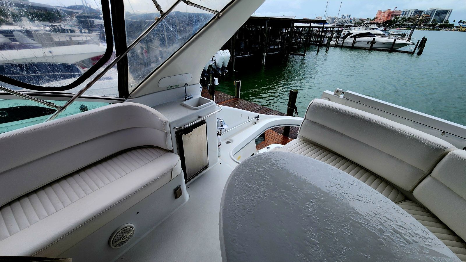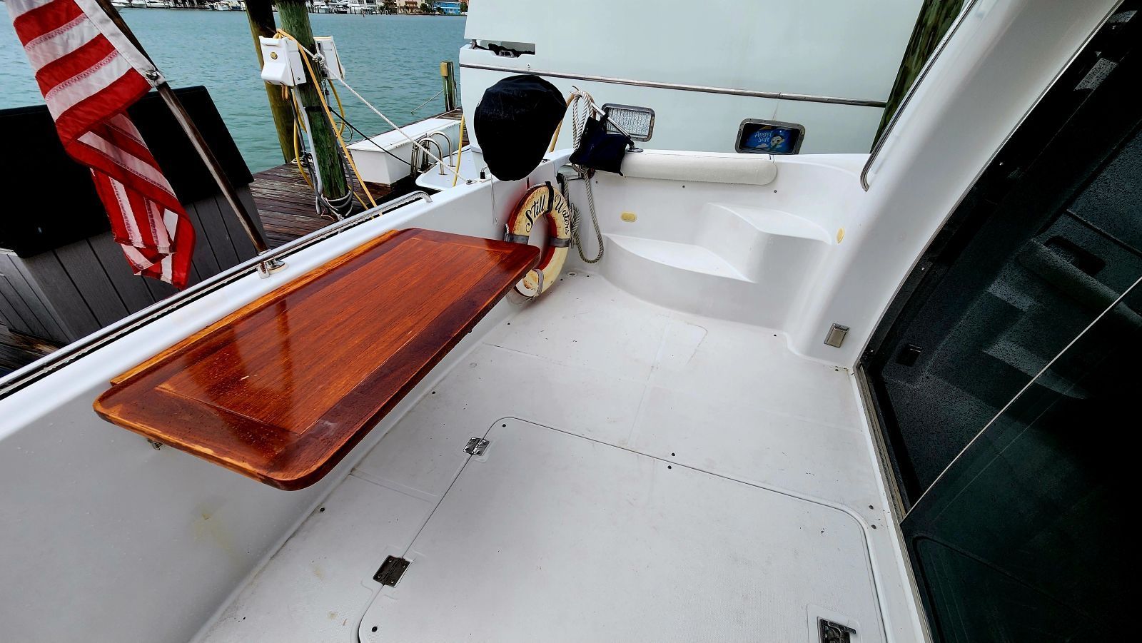 The raised pilothouse is the heart of Still Waters. With panoramic visibility and upgraded Garmin electronics, it offers the confidence and control needed for extended cruising. A refinished dinette table provides a comfortable place to enjoy meals or chart out the day’s route, while the elevated position allows guests to share the view with the captain. Access to the flybridge is via molded steps from the aft cockpit, while the pilothouse remains a dedicated, climate-controlled command center and social space. Carver Voyager 450 Flybridge
