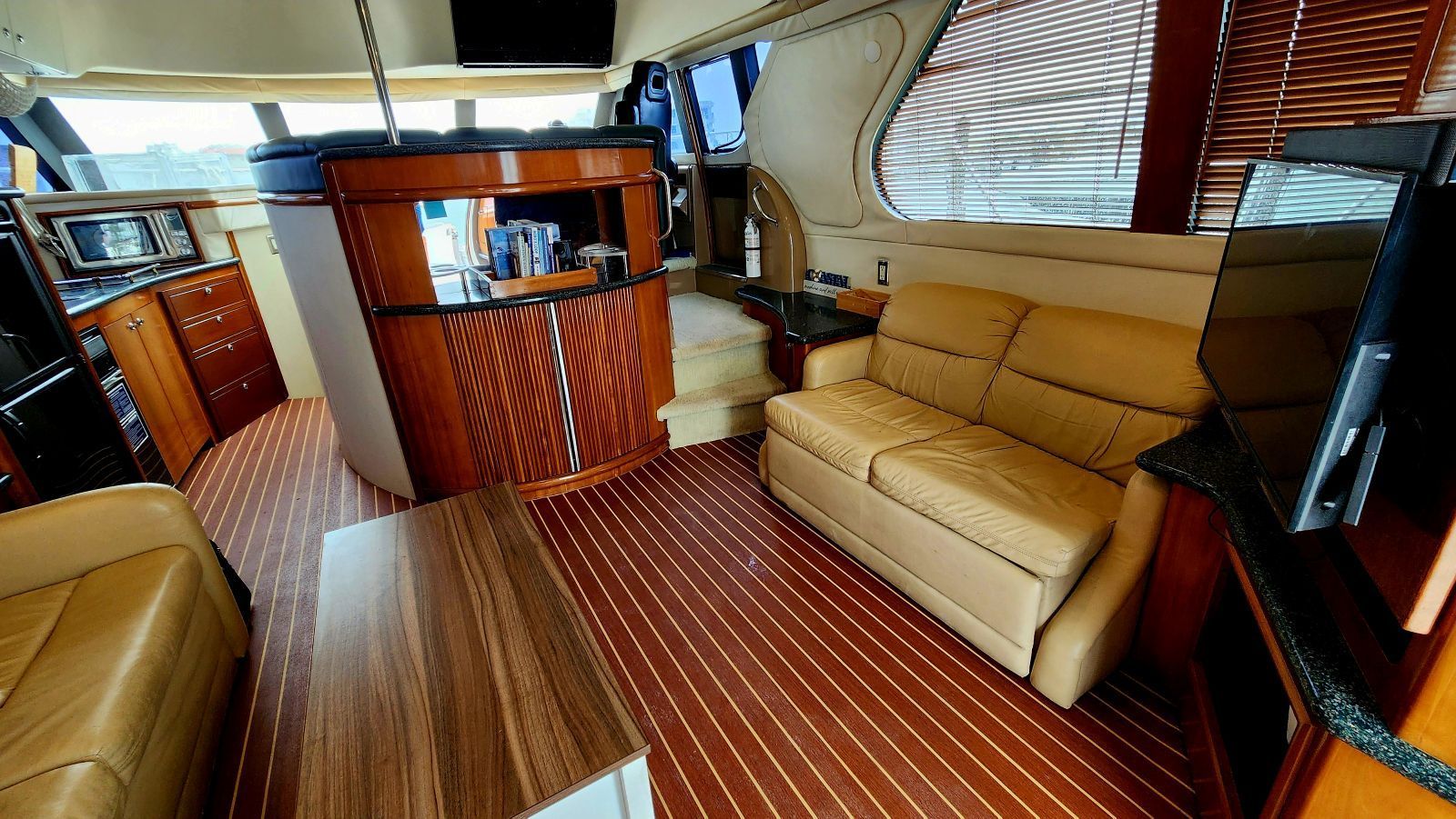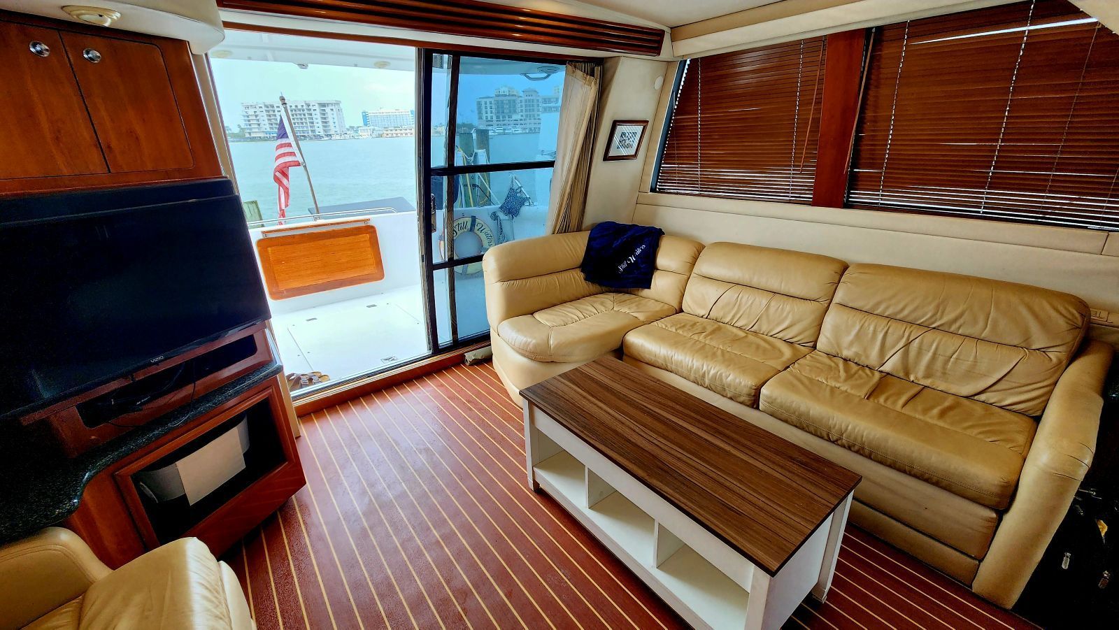 Through the sliding glass door, you step into a salon that immediately feels bright, open, and welcoming. Large windows flood the space with natural light, and clear sightlines forward highlight the seamless connection to the raised pilothouse. From here, molded steps lead to the flybridge—one of Still Waters’ favorite gathering spaces—while a forward companionway provides access to two private staterooms and two well-appointed heads. Every transition feels natural, a reflection of how thoughtfully this 450 Pilothouse was designed for comfort and usability. Carver Voyager 450 Main Salon