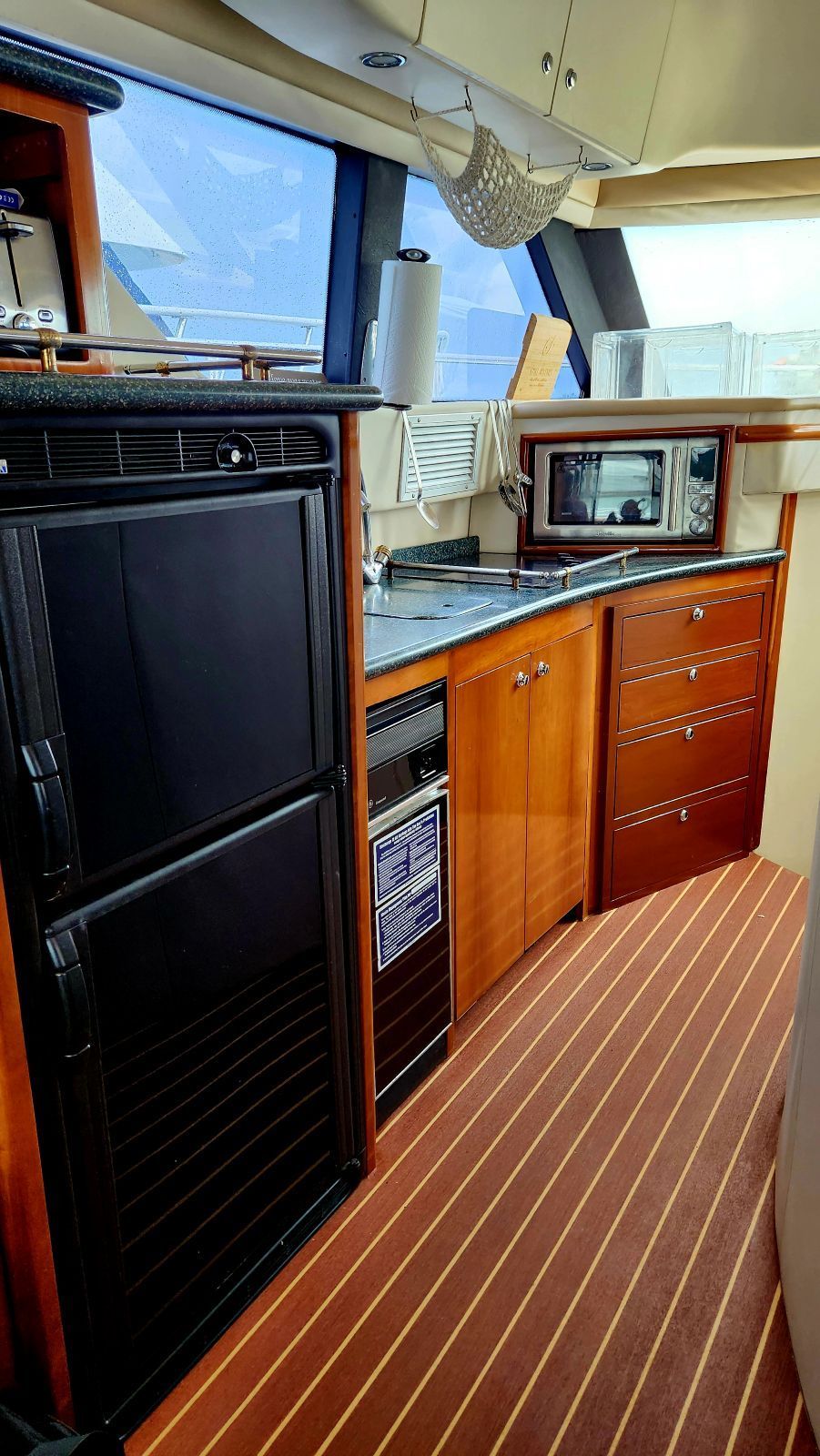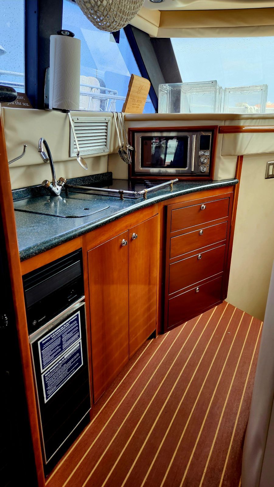 The salon aboard Still Waters is both stylish and functional. Large windows flood the space with natural light, while the gorgeous teak and holly flooring adds a luxurious warmth and timeless yachting character. Beyond its elegance, the flooring is also highly durable and easy to maintain, making it ideal for life aboard. New blinds and tasteful furnishings enhance the inviting atmosphere, while an upgraded entertainment system with Sony soundbar and flat-screen TV creates the perfect setting for both relaxing evenings and lively gatherings with friends. Carver Voyager 450 Galley
