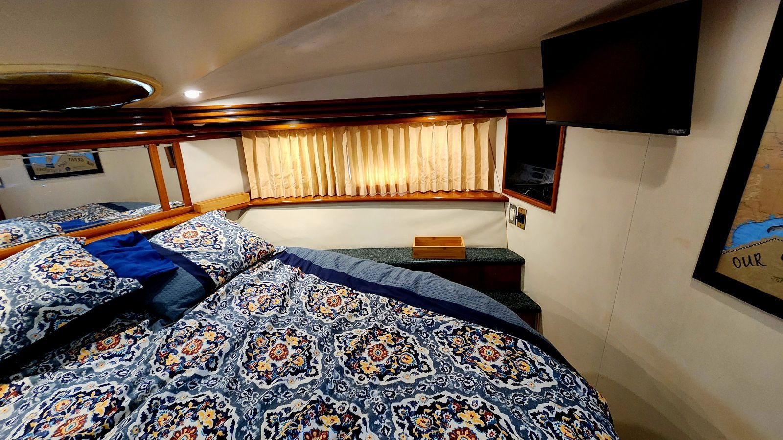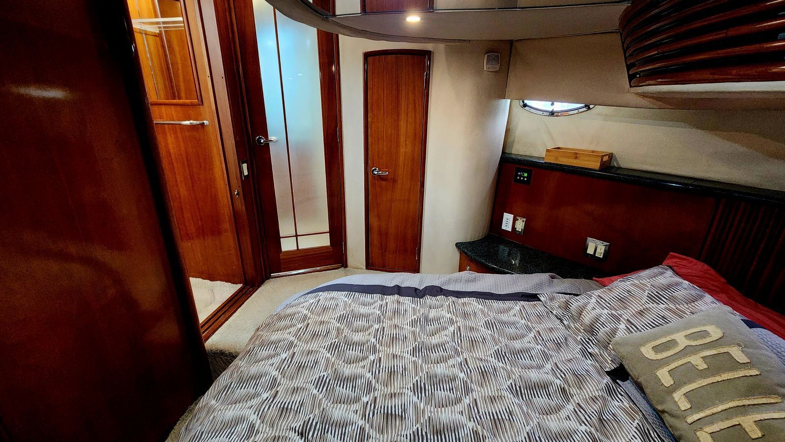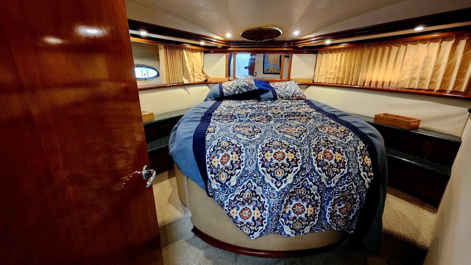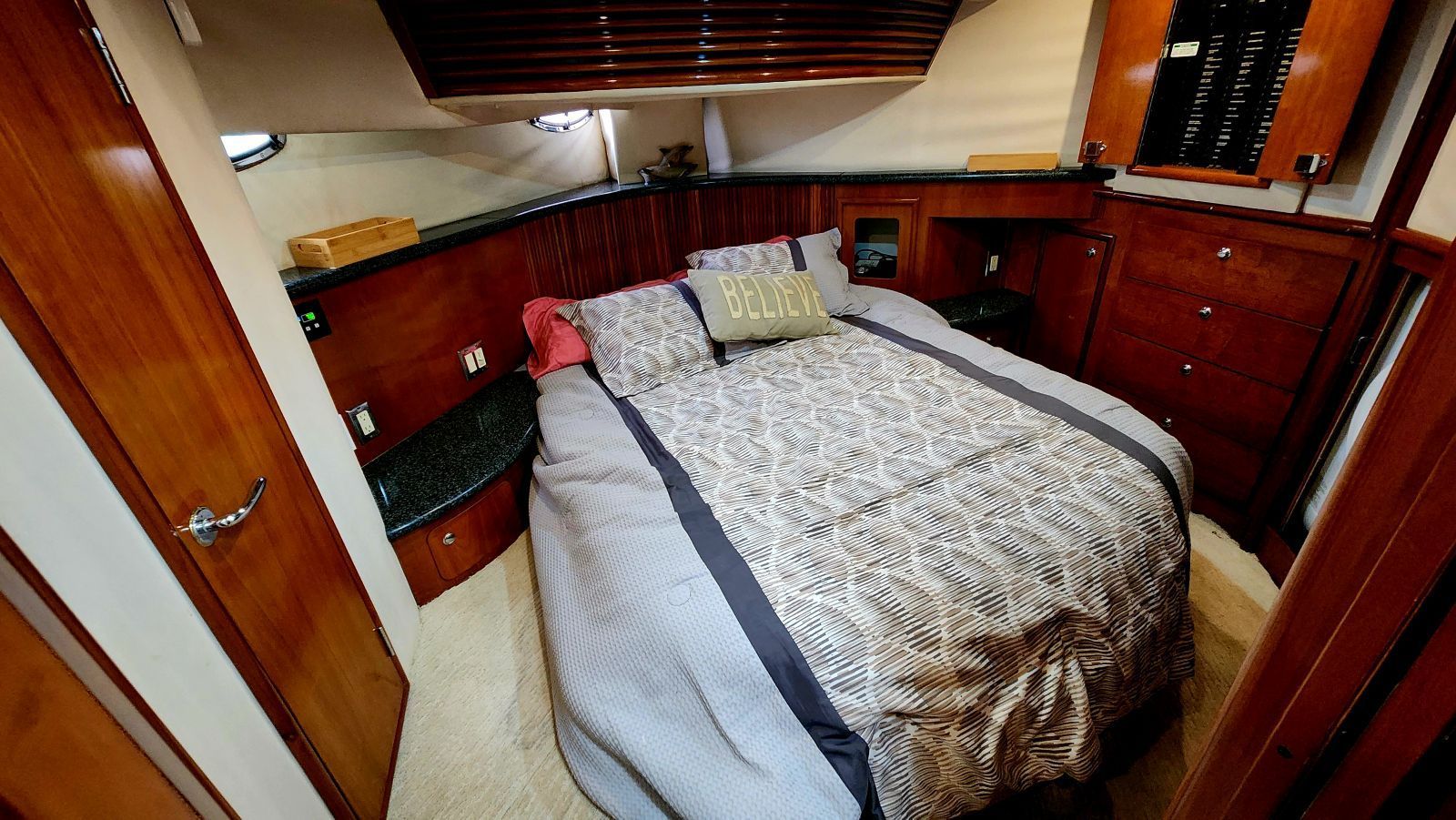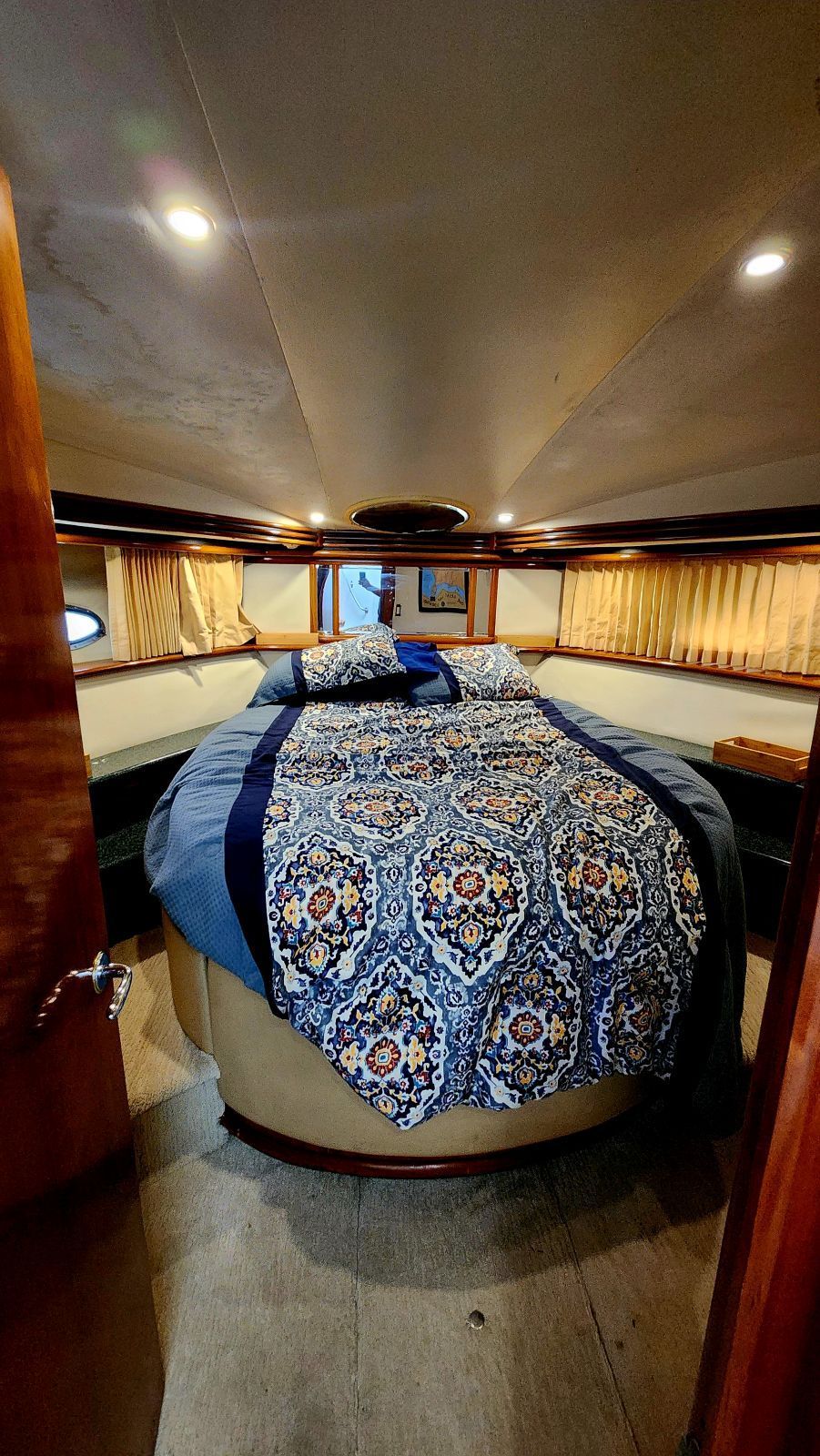 Stepping forward from the galley, the companionway aboard Still Waters continues the rich teak and holly flooring, enhancing the sense of warmth and continuity throughout the interior. This space leads directly to the private accommodations, with efficient LED lighting and well-crafted cabinetry creating a welcoming transition to the staterooms and heads. Carver Voyager 450 Master Stateroom