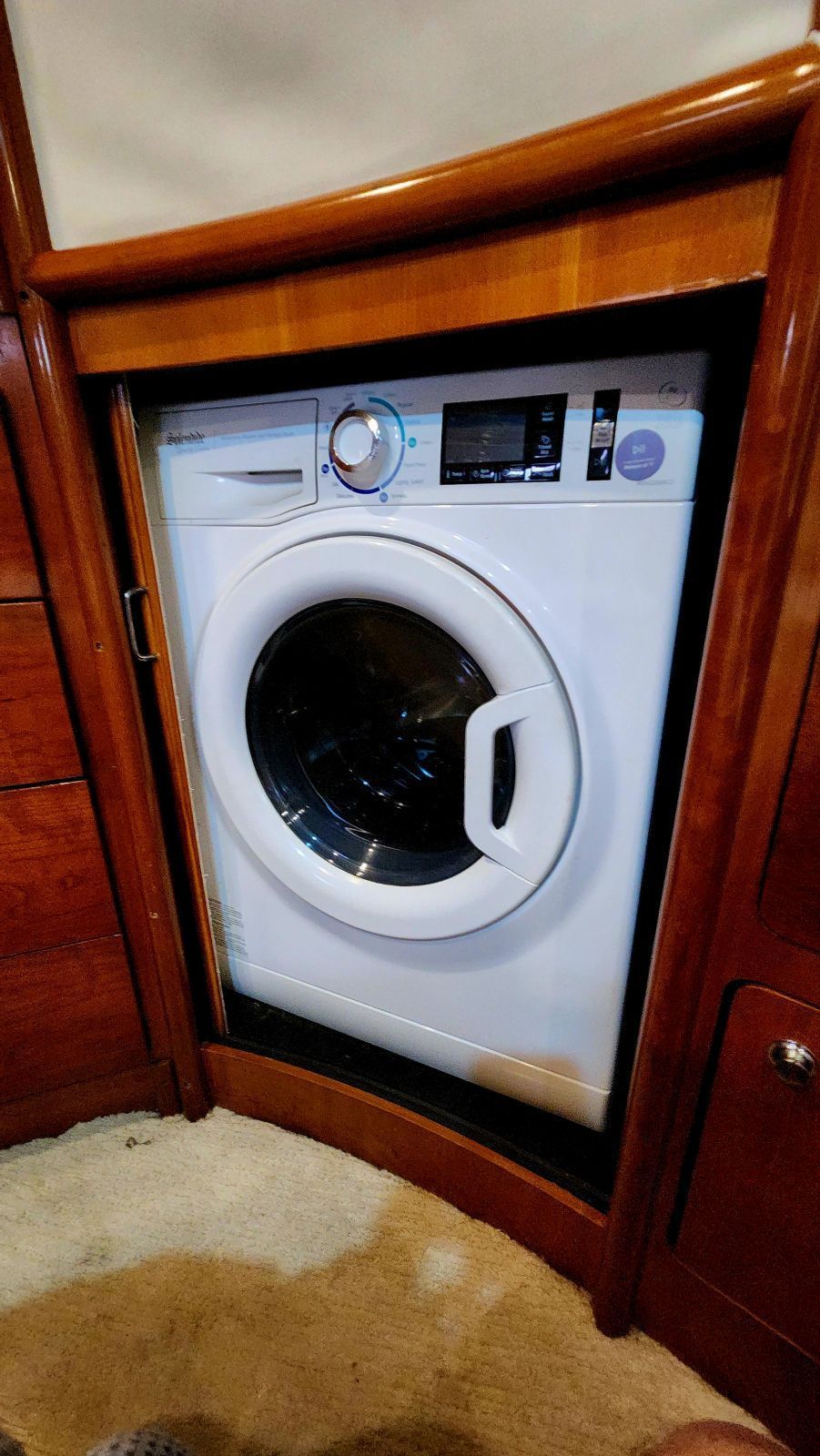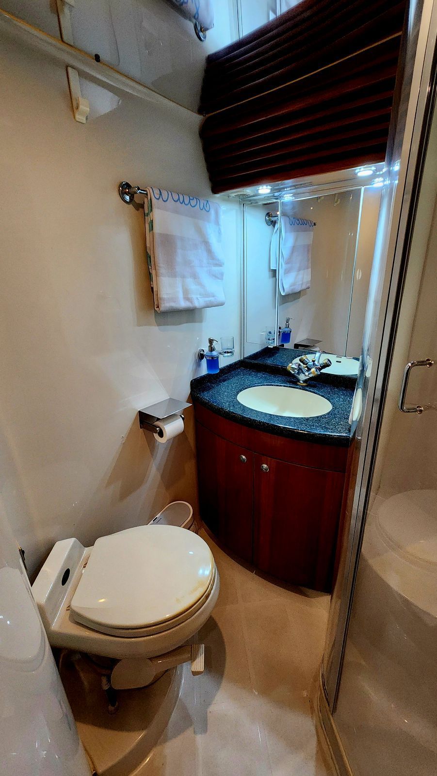 Located aft, the master stateroom aboard Still Waters is a comfortable retreat designed for extended cruising. A walkaround berth makes access easy, while generous storage and custom cabinetry provide plenty of space for personal belongings. The new plush carpeting adds a touch of luxury and ties the space to the rest of the interior. A flat-screen TV offers onboard entertainment, and for added convenience, a new Splendide washer/dryer is integrated into the stateroom. Opening ports bring in natural light and ventilation, making this space both functional and inviting. Carver Voyager 450 Master Head