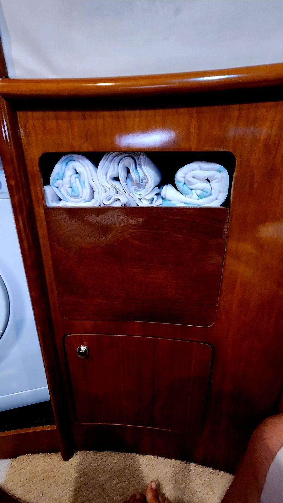 The master head aboard Still Waters is thoughtfully designed for comfort and privacy. A separate shower stall makes it practical for extended cruising, while the Vacuflush toilet system (recently serviced and upgraded with new components) ensures reliable operation. Updated fixtures and cabinetry provide a clean, modern feel, and the warm teak accents tie it seamlessly into the yacht’s interior styling. With ample storage and easy-to-clean surfaces, this space balances functionality with a touch of luxury—perfect for life aboard. Carver Voyager 450 Guest Stateroom