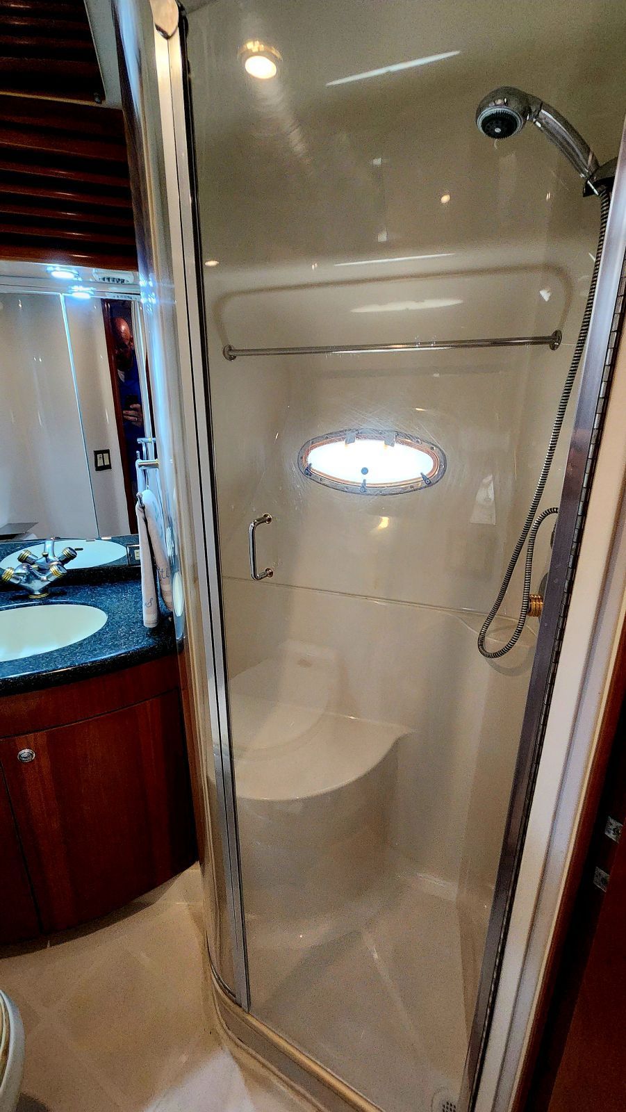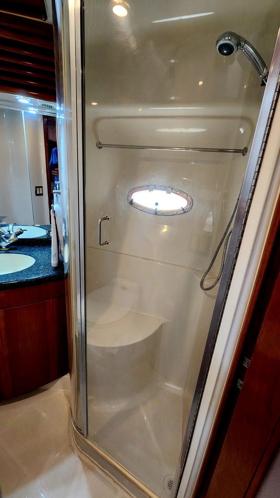 Forward, the VIP stateroom aboard Still Waters provides a welcoming retreat for guests. A centerline berth, hanging lockers, and generous storage make it practical for extended stays. Updated plush carpeting underfoot gives the space a soft, comfortable feel, complementing the warm wood accents found throughout the interior. Natural light from the overhead hatch and side portholes brightens the room and provides excellent ventilation. Just steps away, the guest head is conveniently located off the companionway, ensuring comfort and privacy without compromising space in the stateroom. Carver Voyager 450 Guest Head