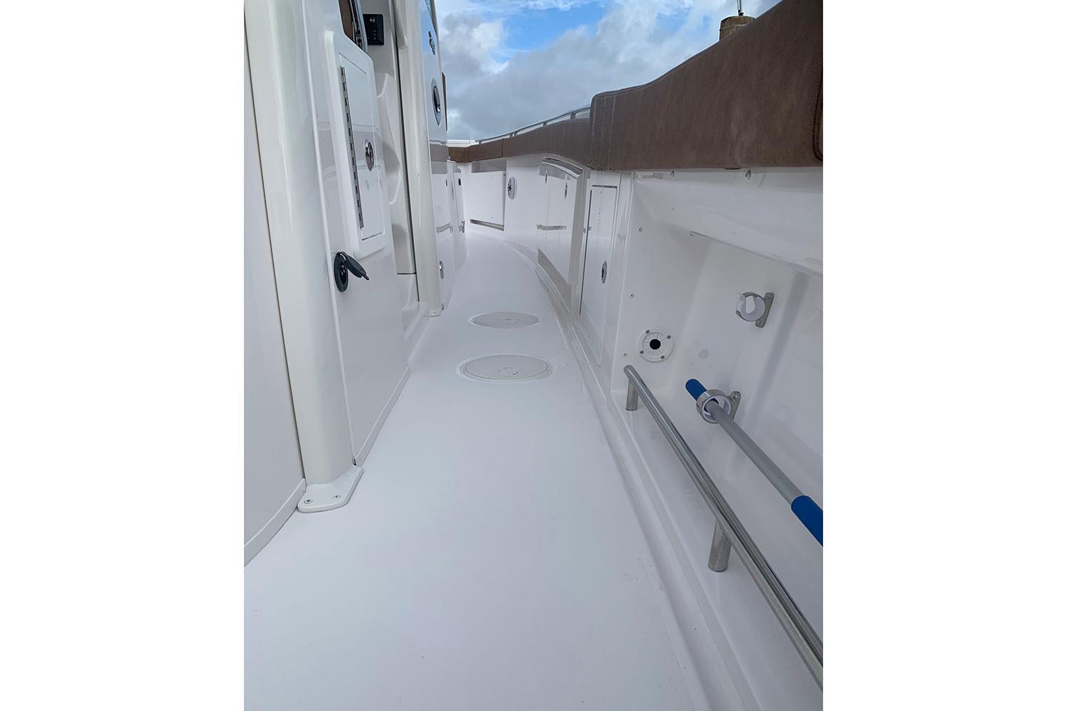 - Fiberglass hardtop with integrated powder coated aluminum supports, aft and fwd facing Lumitec® spreader lights, (7) rocket launchers, overhead electronics pod with storage, molded in radar pod and (4) overhead lights, easy access pass through hatch, (4) speaker pods, and 3-sided custom glass windshield with electrically actuated windshield vent