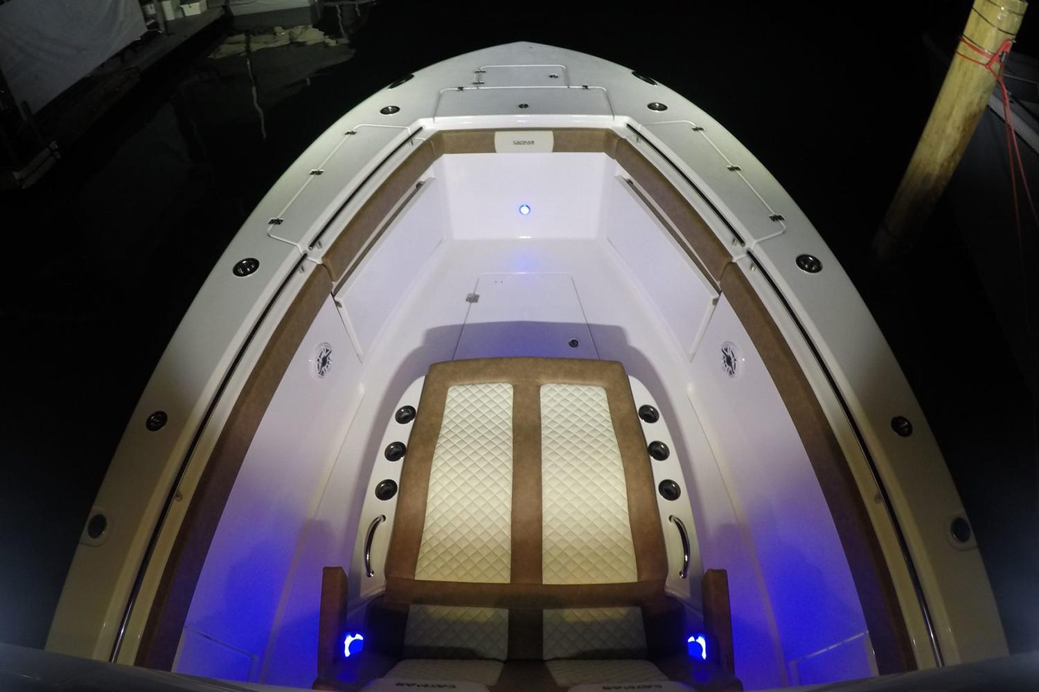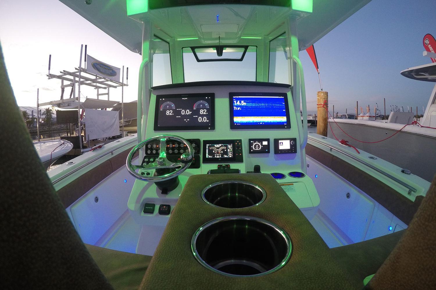 - Forward chaise lounge seating with armrests integrated into console with dry storage, (2) lighted cup holders, grab handles, and (6) rod holders