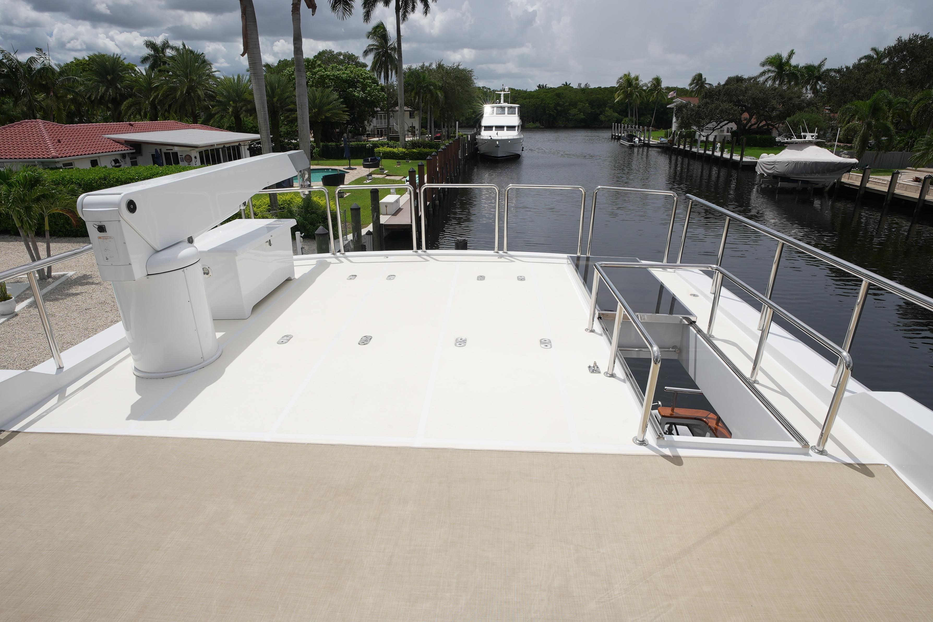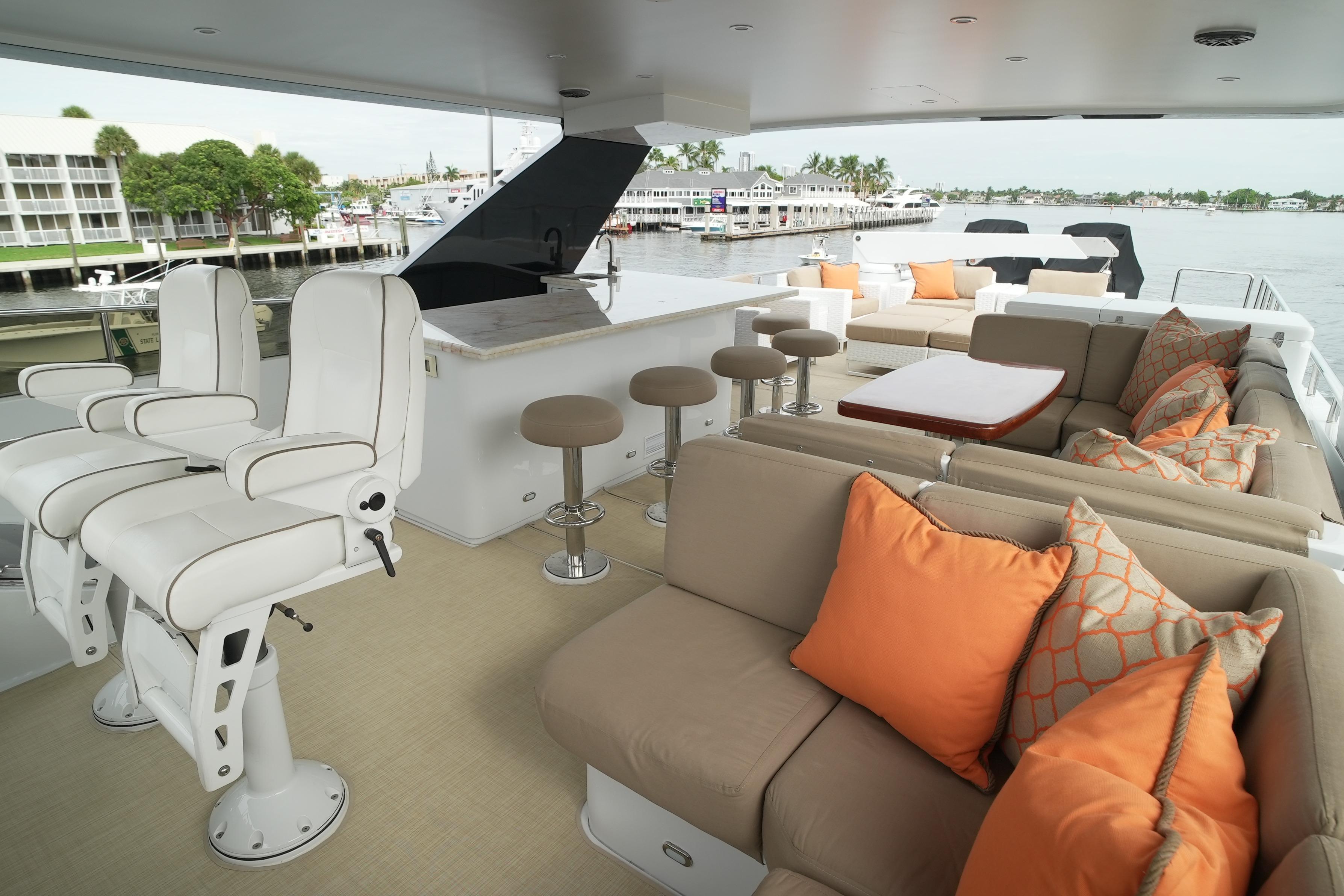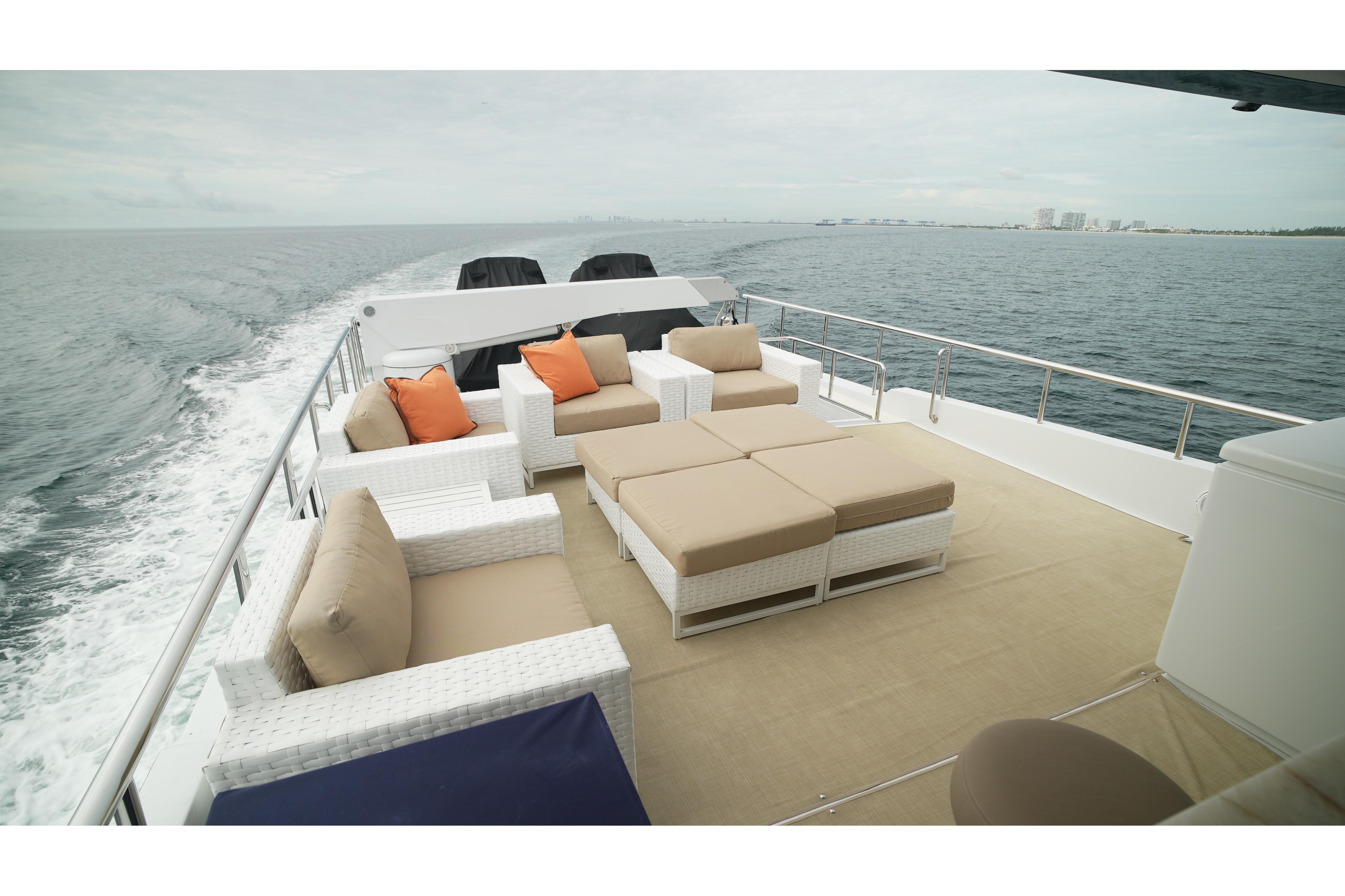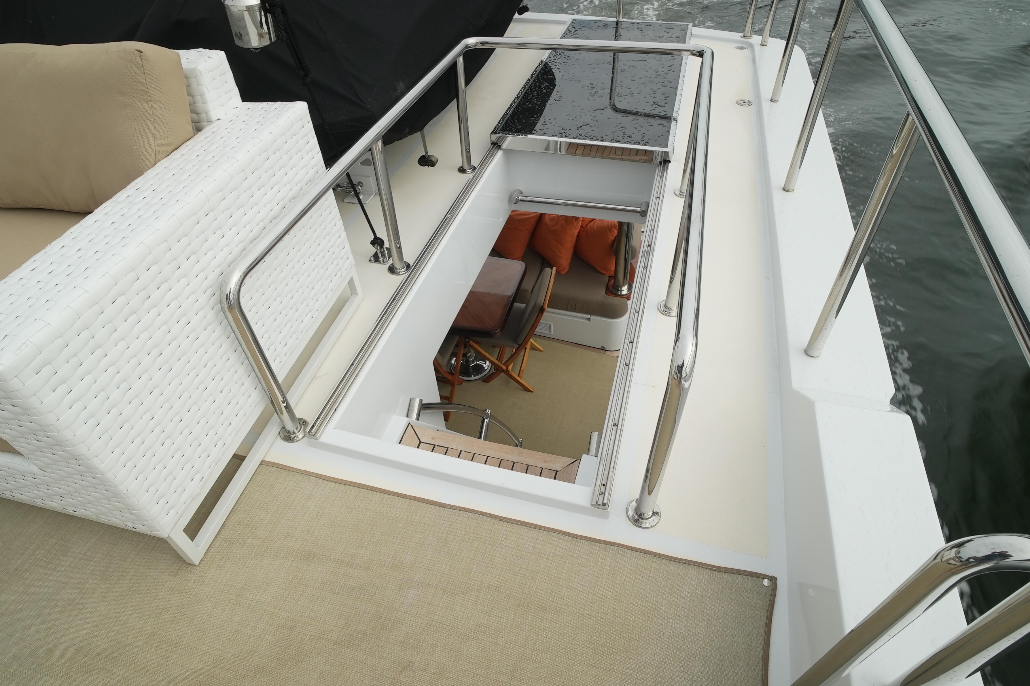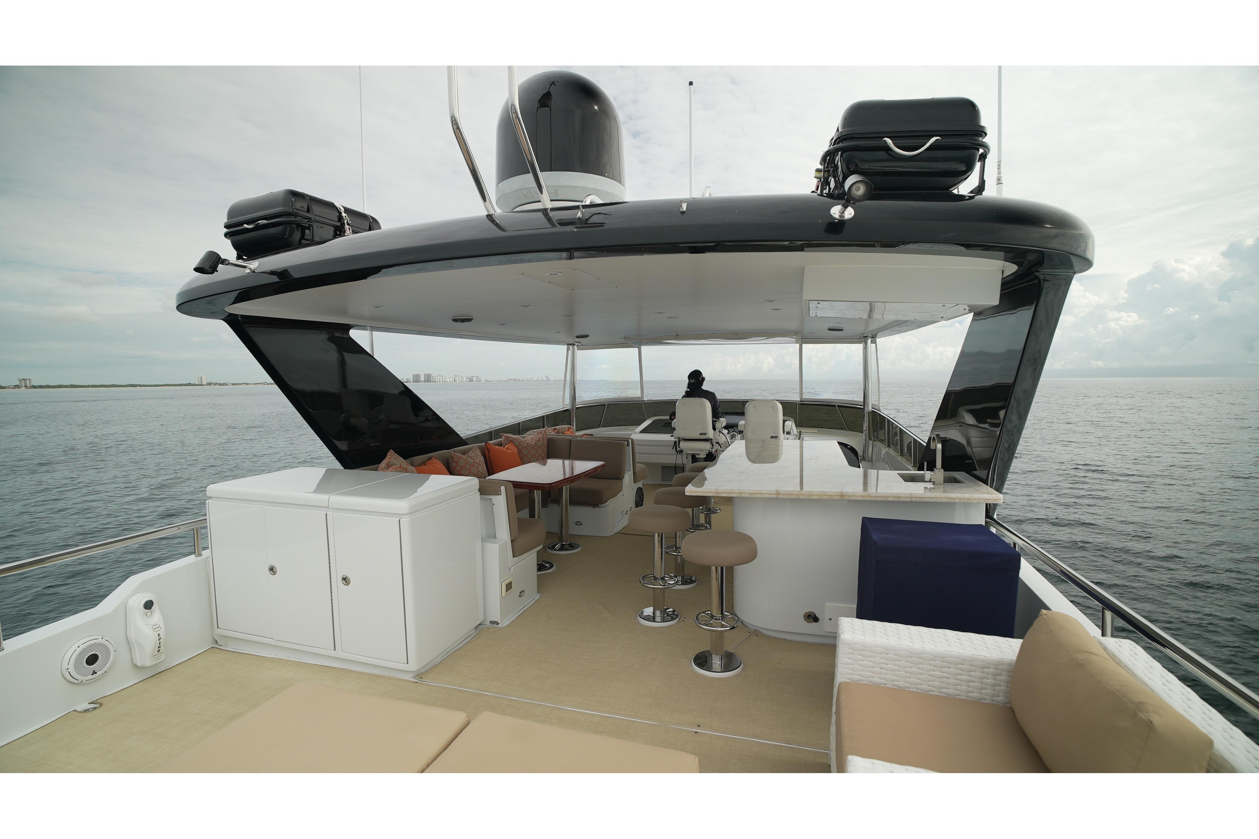 On the top deck, SEA 2 SEA offers a spacious flying bridge enclosed with custom Eisenglass and protected by a fiberglass hardtop. Just aft of this enclosed area lies a large sundeck, providing space for a tender, davit, and even a hot tub.