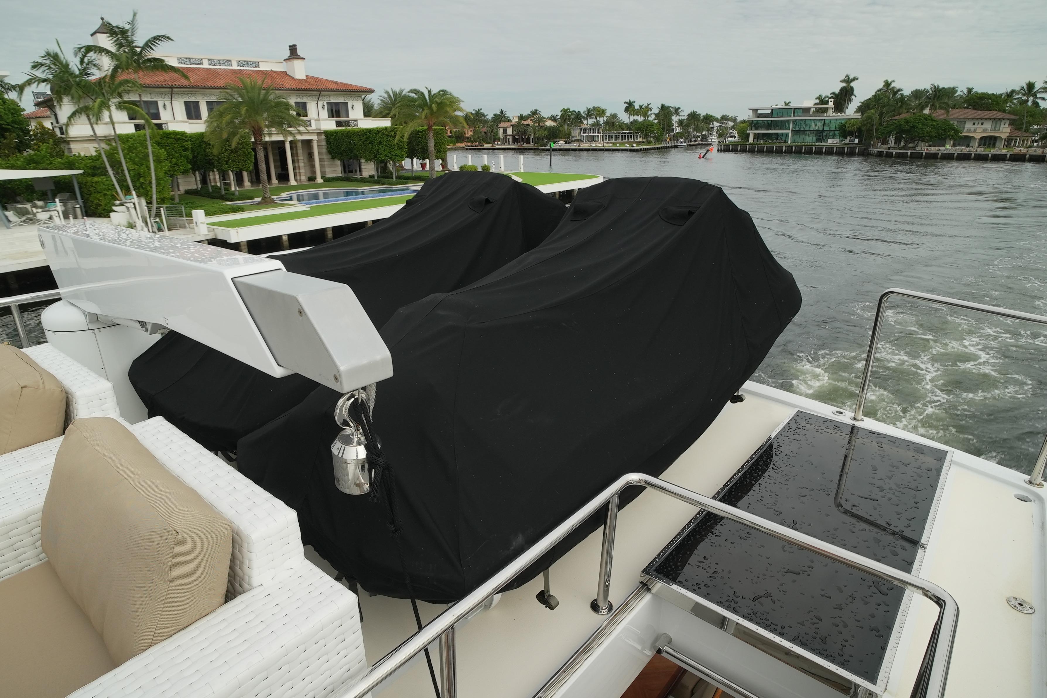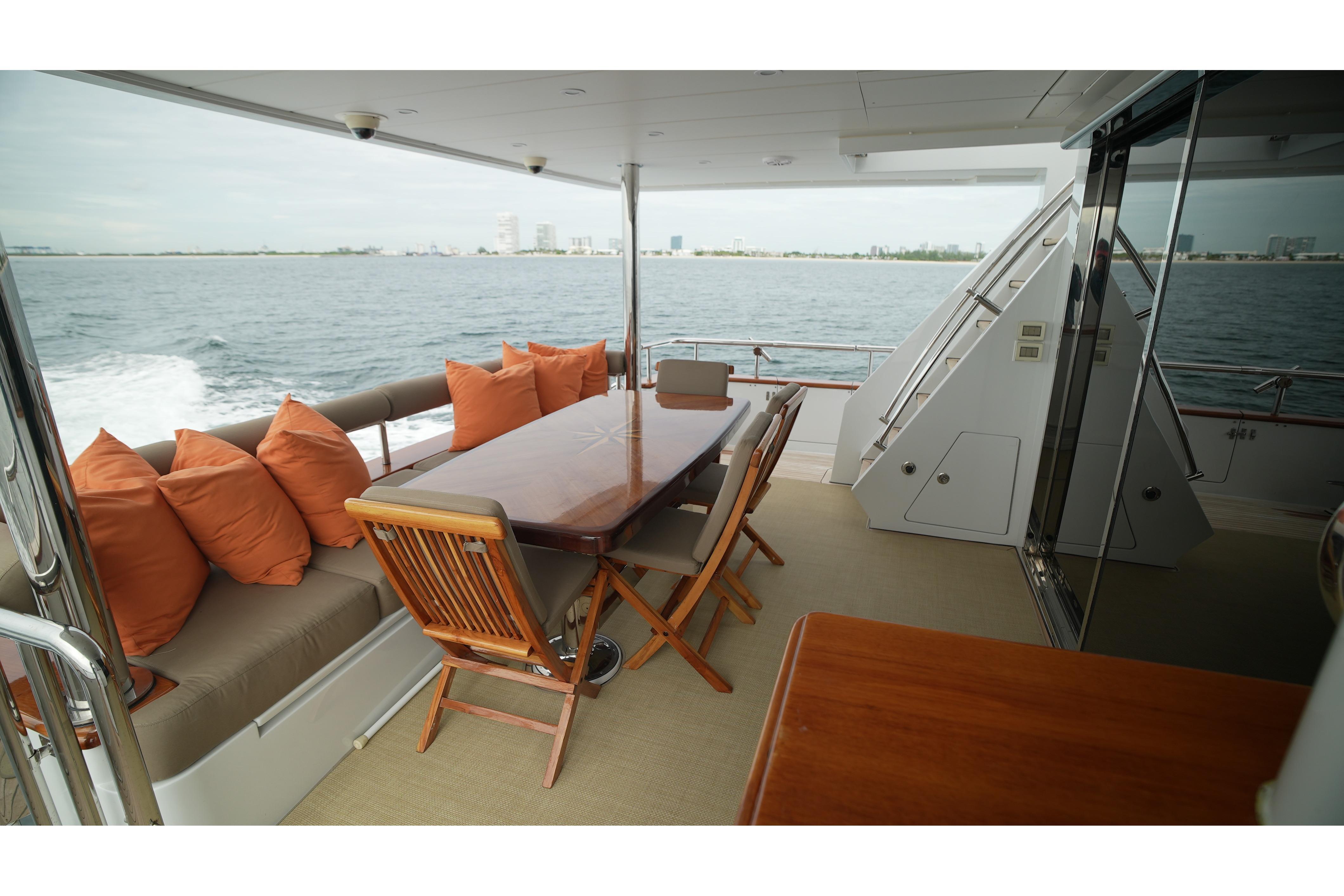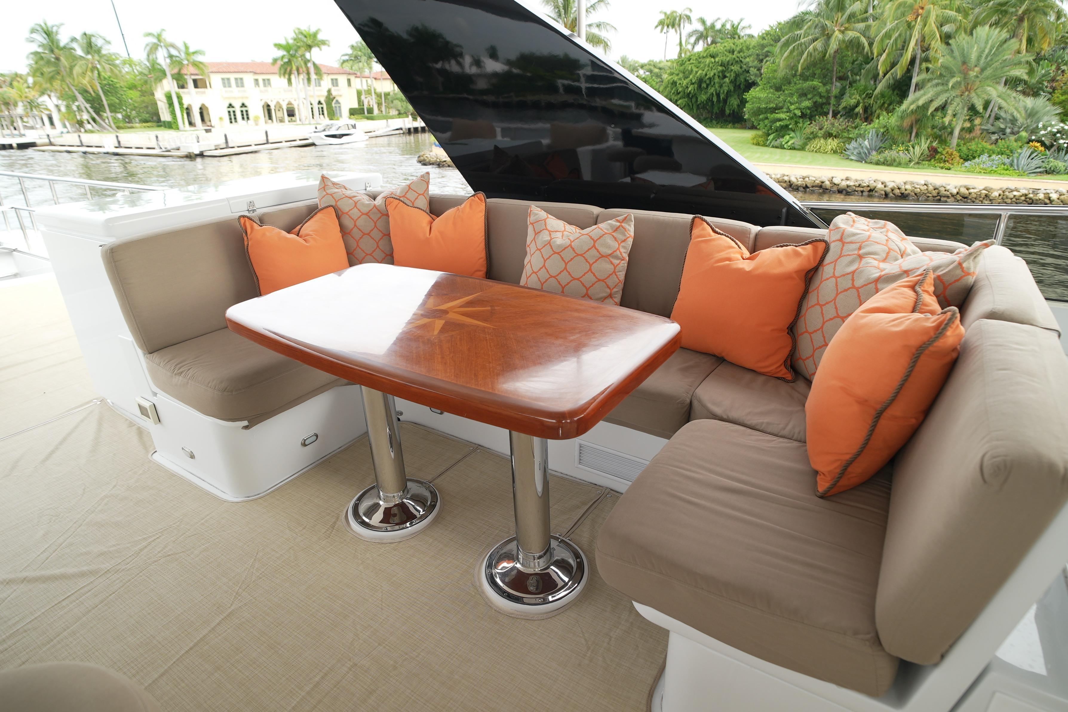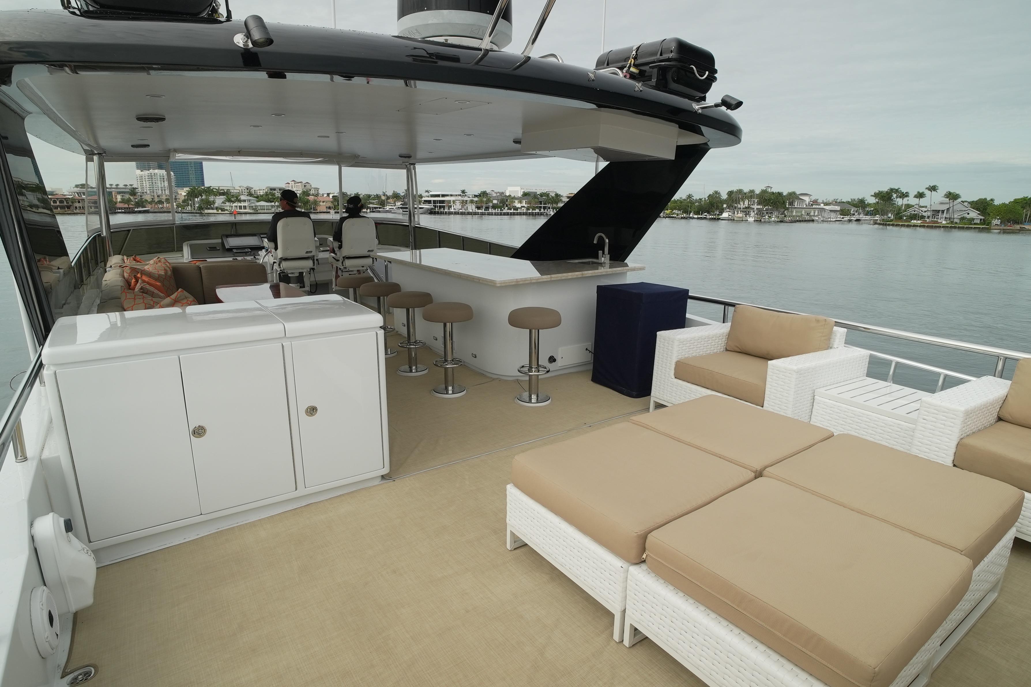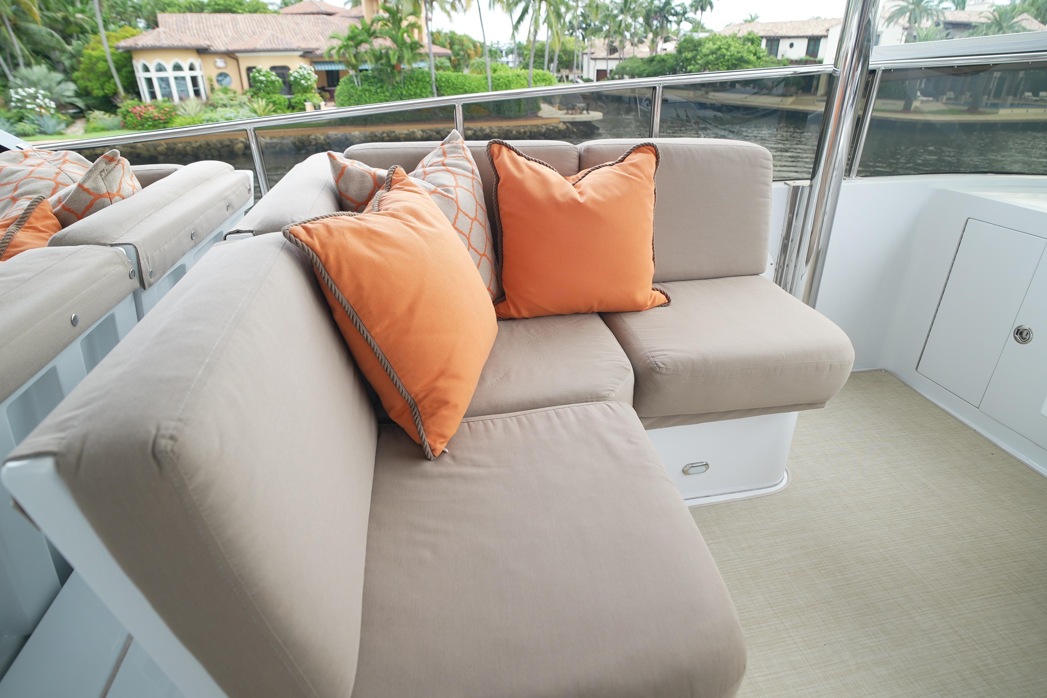 On the top deck, SEA 2 SEA offers a spacious flying bridge enclosed with custom Eisenglass and protected by a fiberglass hardtop. Just aft of this enclosed area lies a large sundeck, providing space for a tender, davit, and even a hot tub.