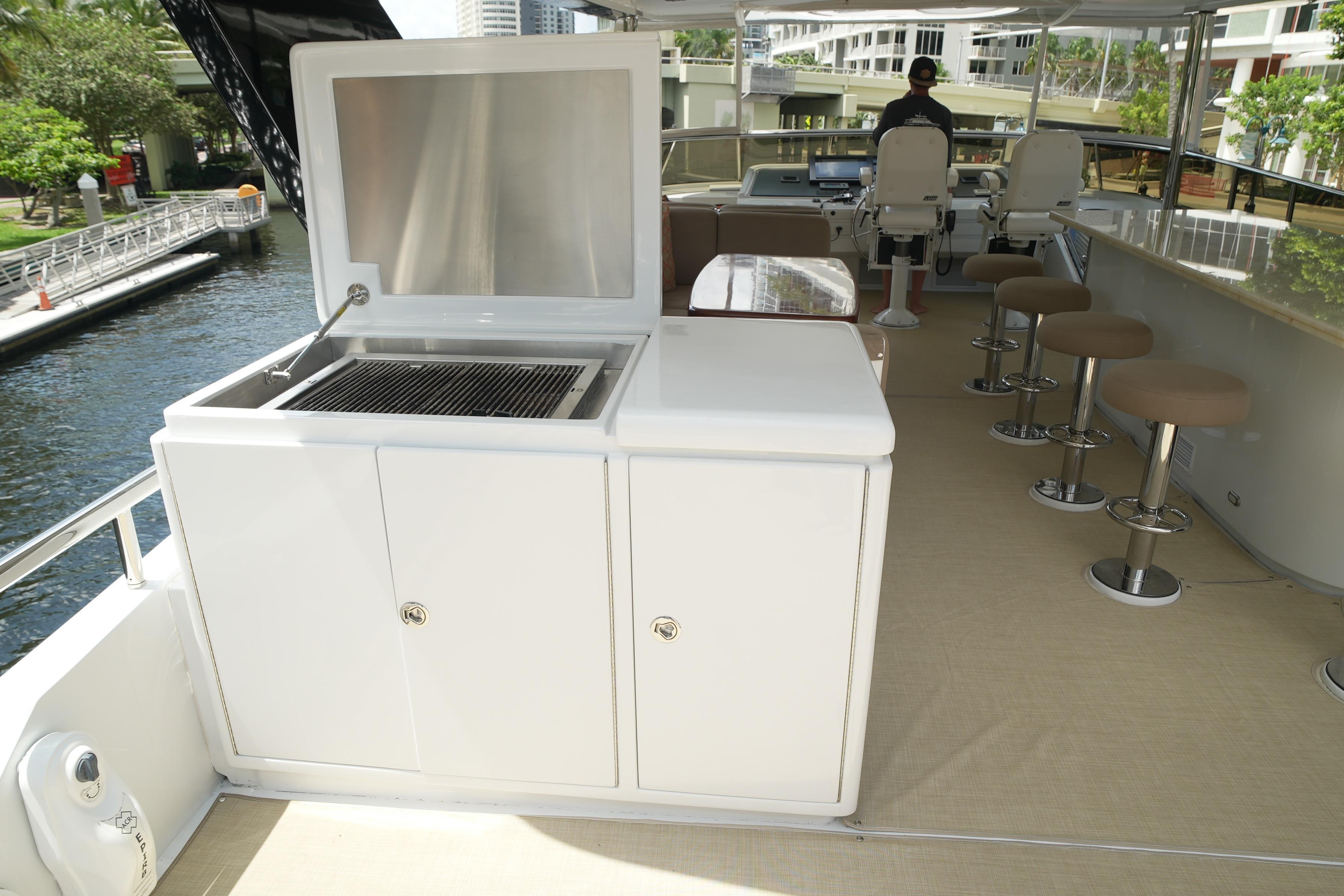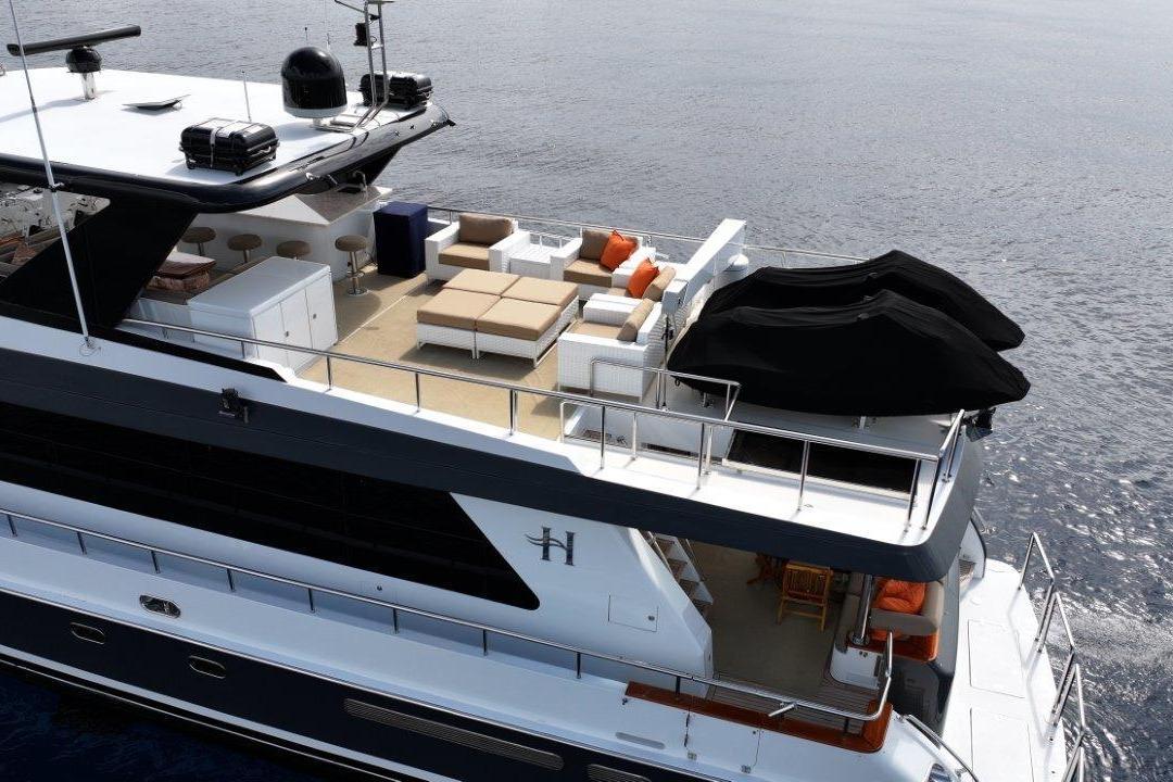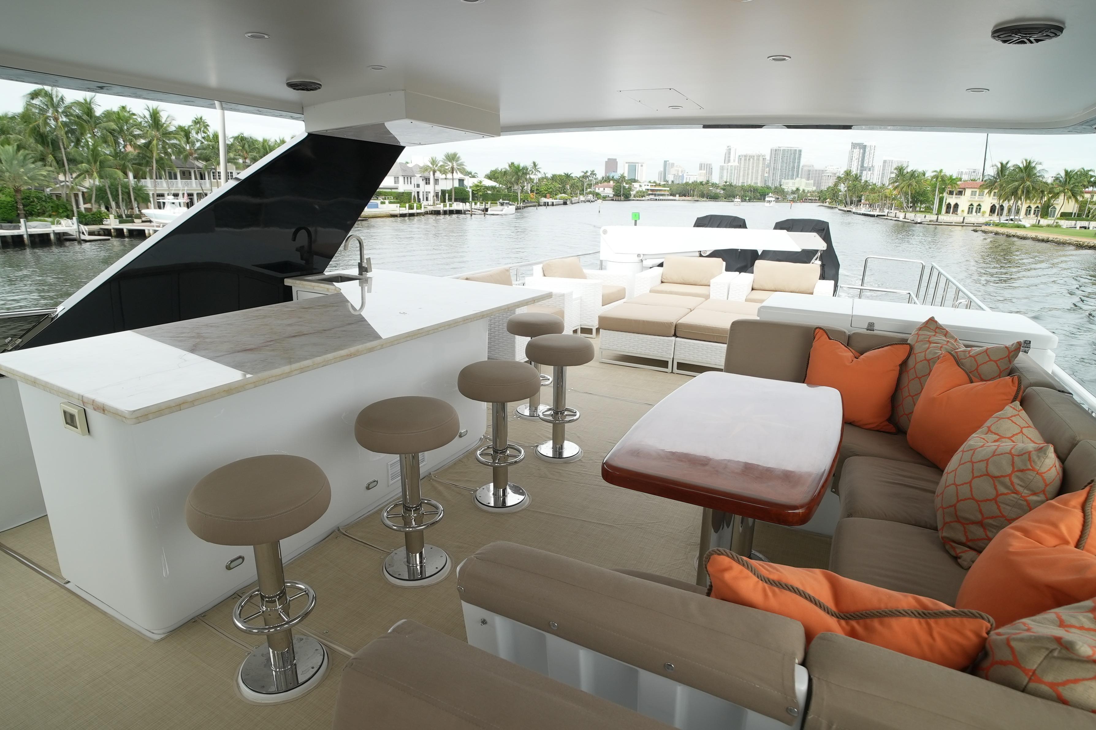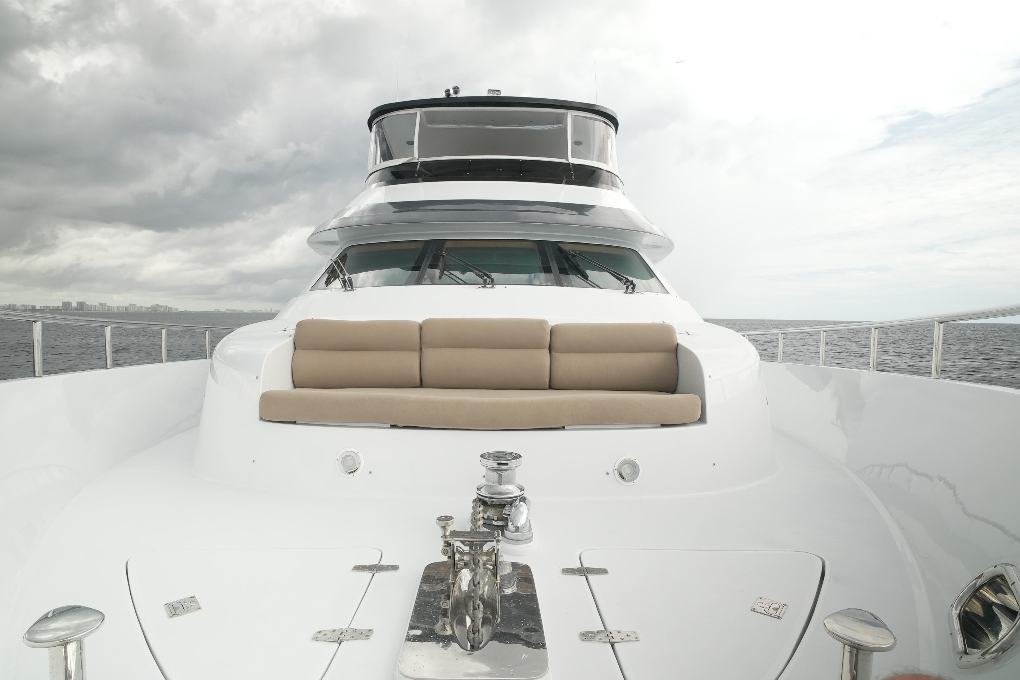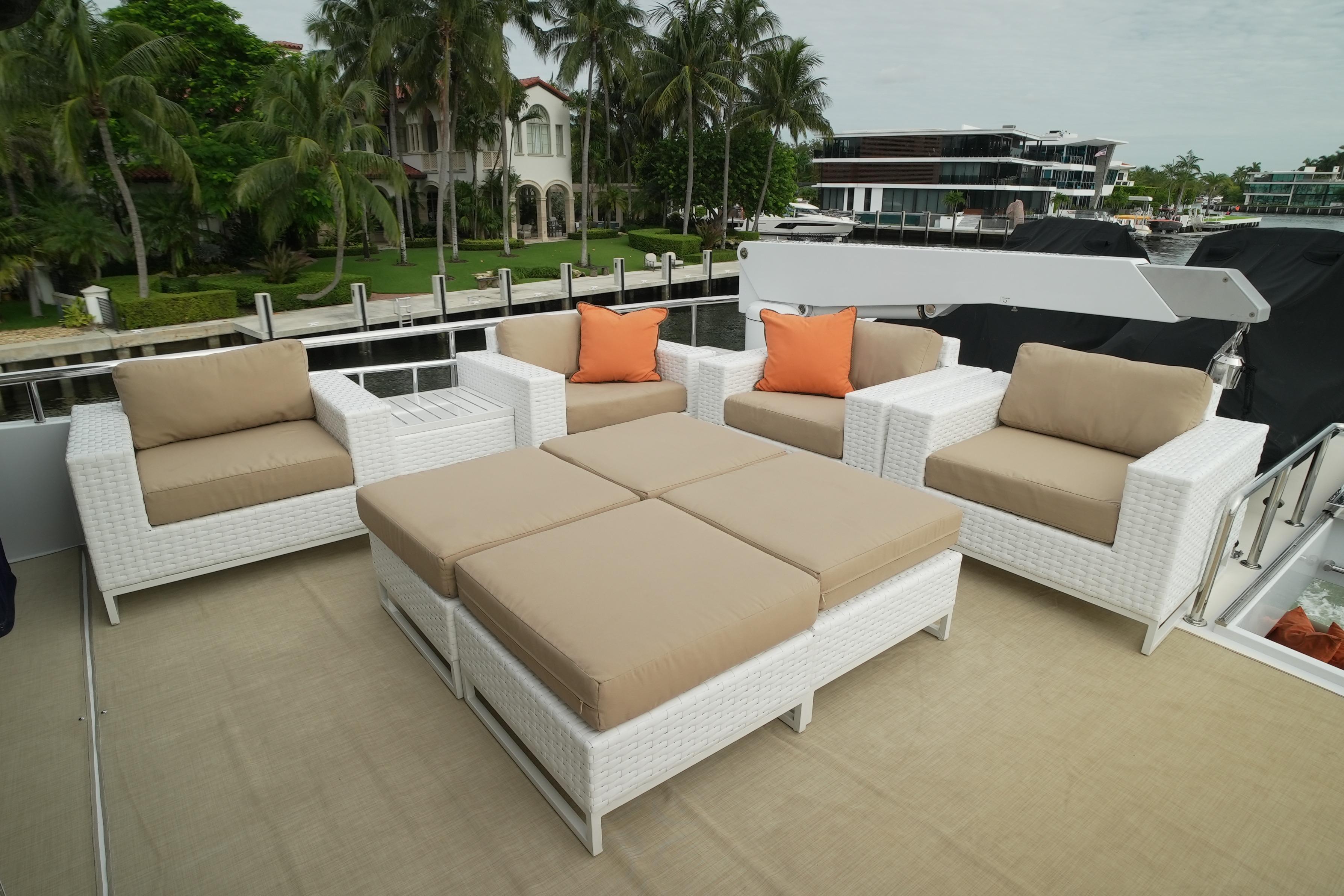 On the top deck, SEA 2 SEA offers a spacious flying bridge enclosed with custom Eisenglass and protected by a fiberglass hardtop. Just aft of this enclosed area lies a large sundeck, providing space for a tender, davit, and even a hot tub.