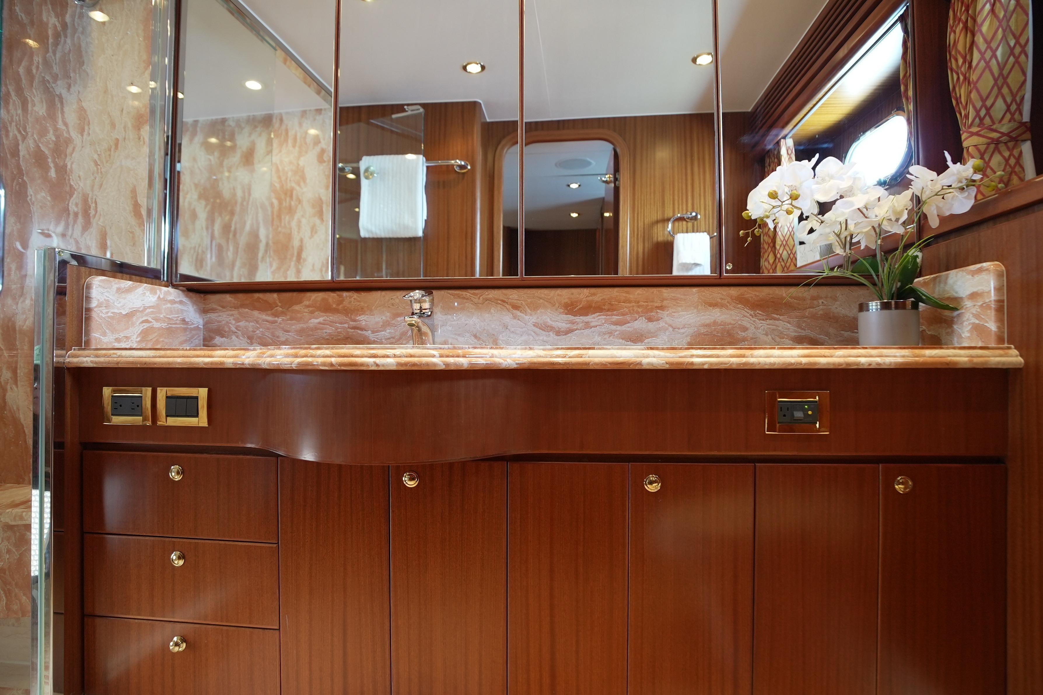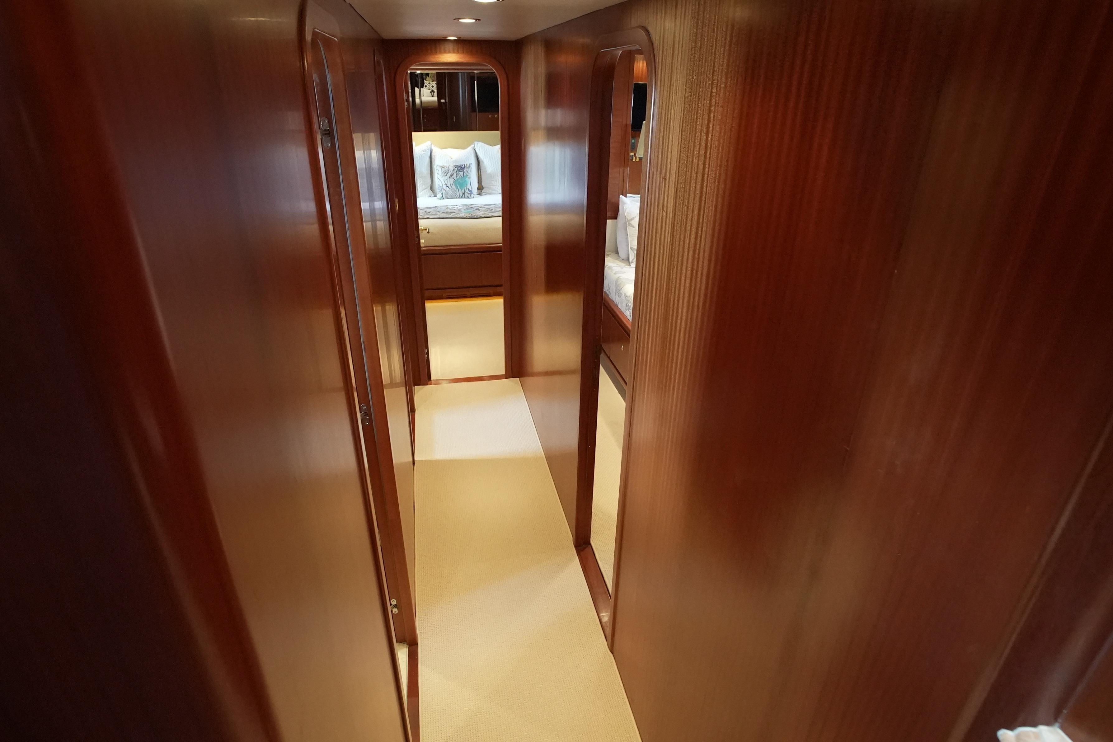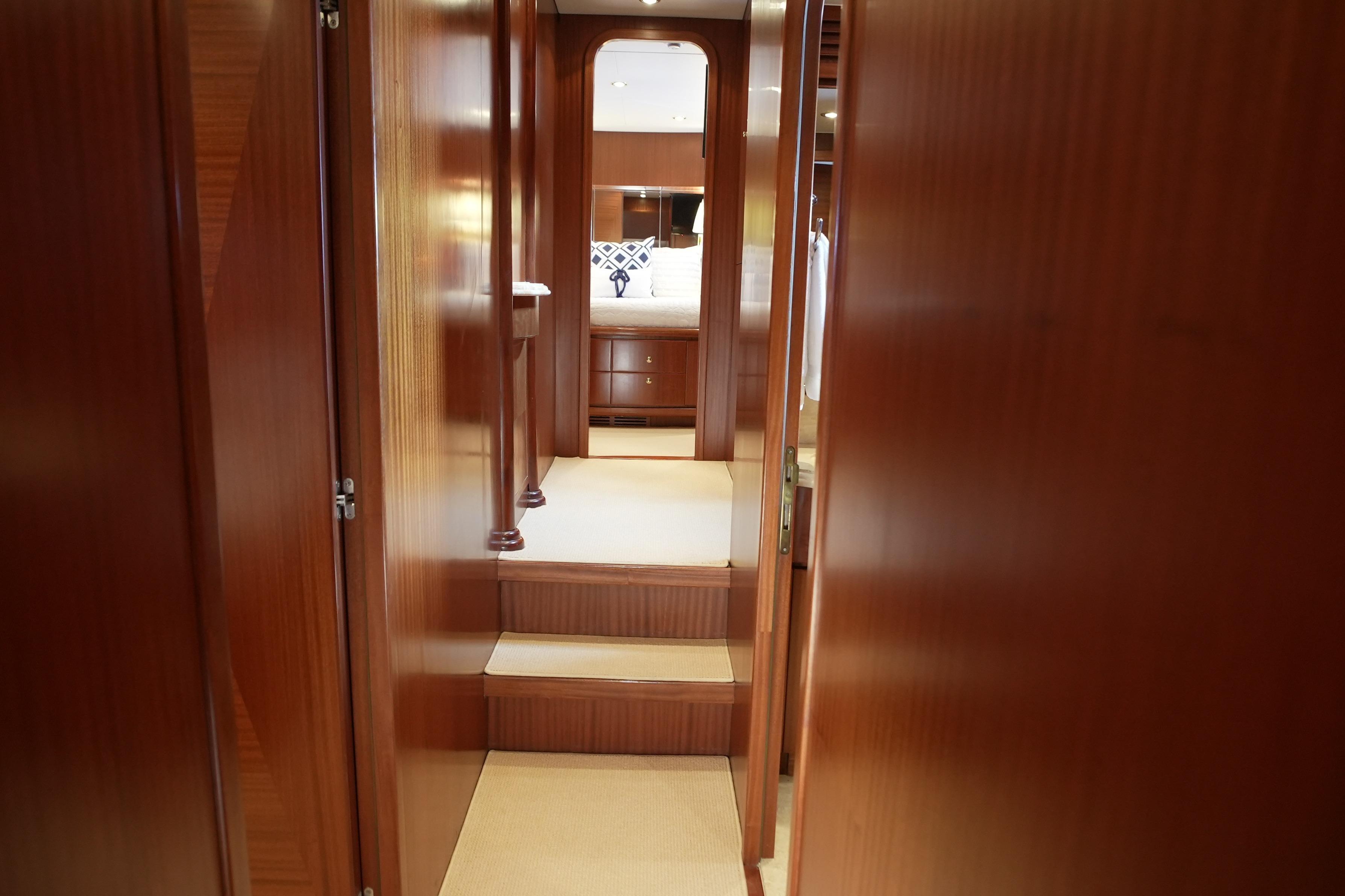 From the galley, a starboard staircase descends to four owner and guest staterooms. The foyer, finished in Sapelli wood, leads to the full-beam master cabin aft, twin guest staterooms to port and starboard, and a forward VIP stateroom. These finely appointed staterooms provide every comfort for guests.