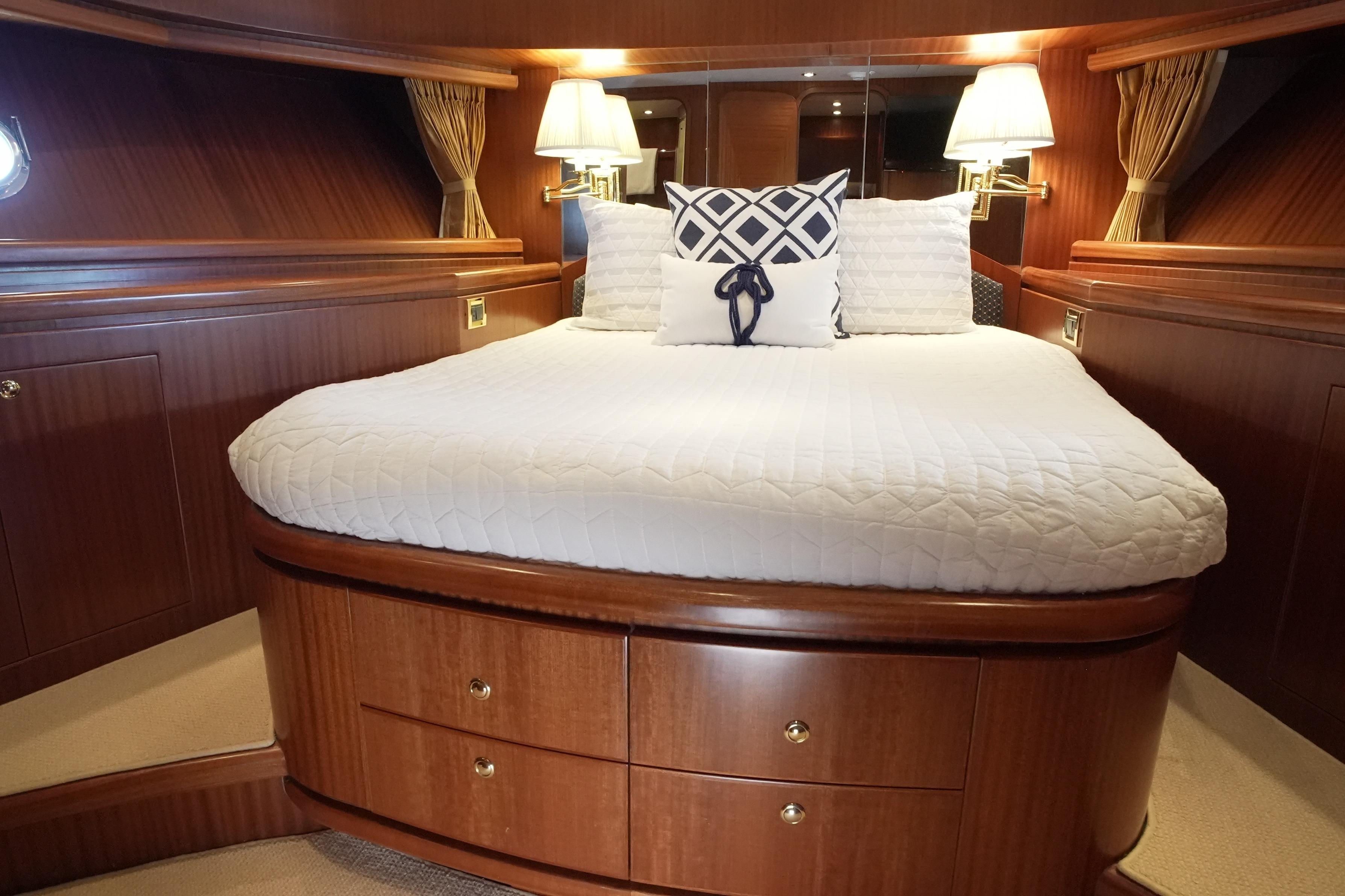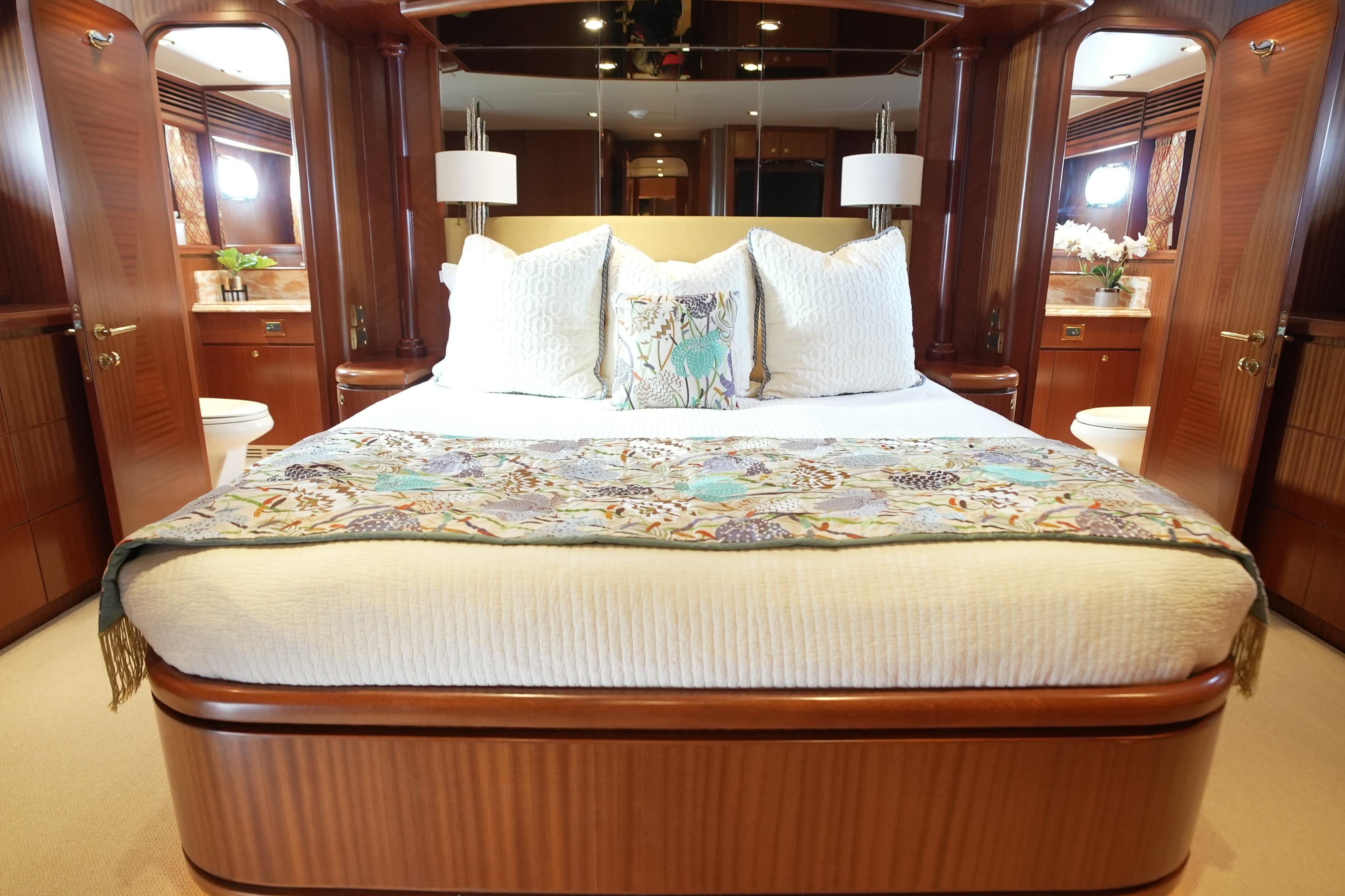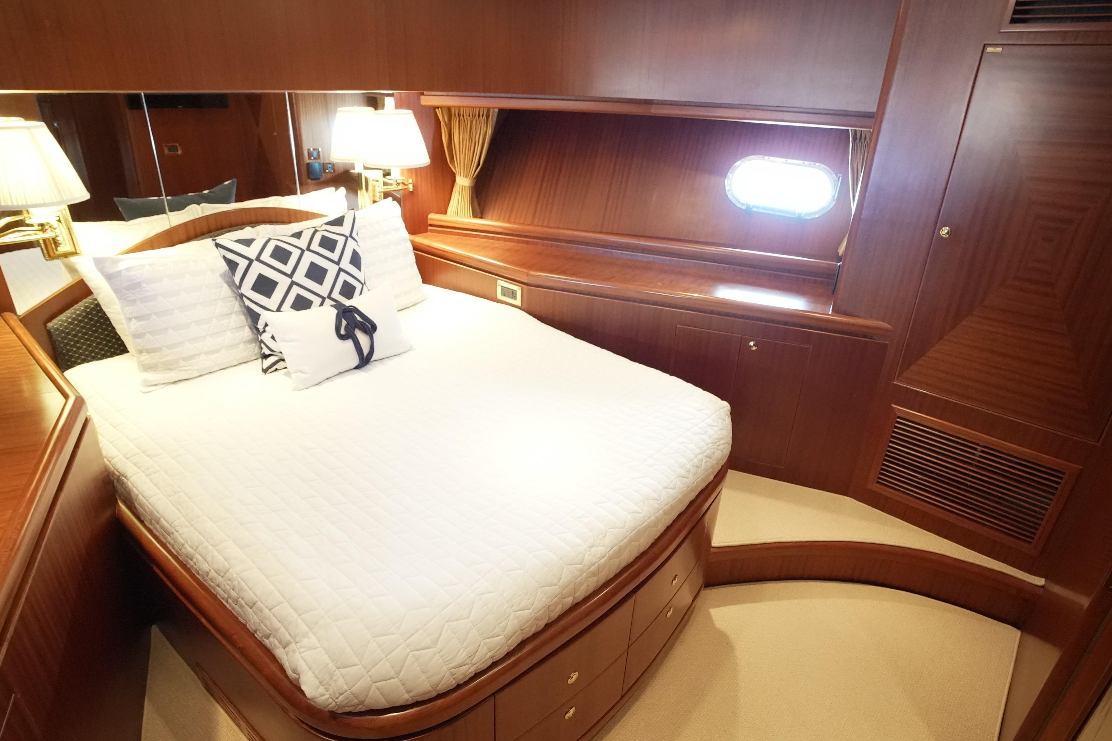 Continuing forward down the foyer, the well-appointed VIP stateroom awaits. A queen size bed, centered in the room and fitted with plush fabrics, ensures your most important guests feel right at home.