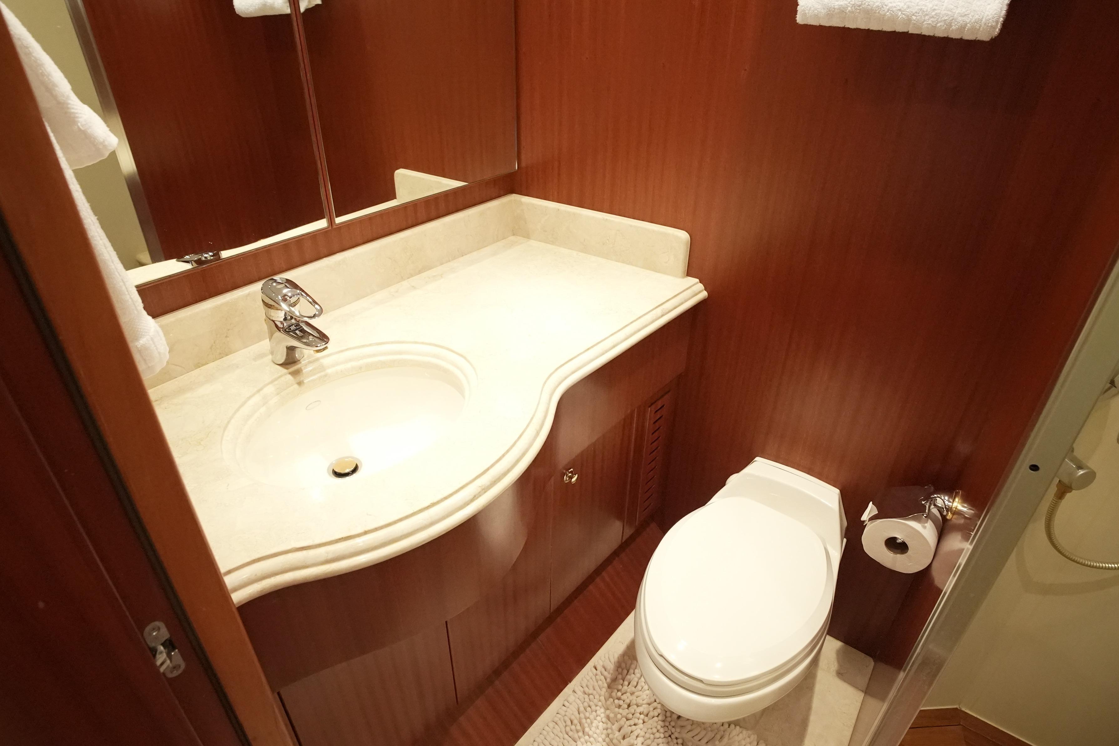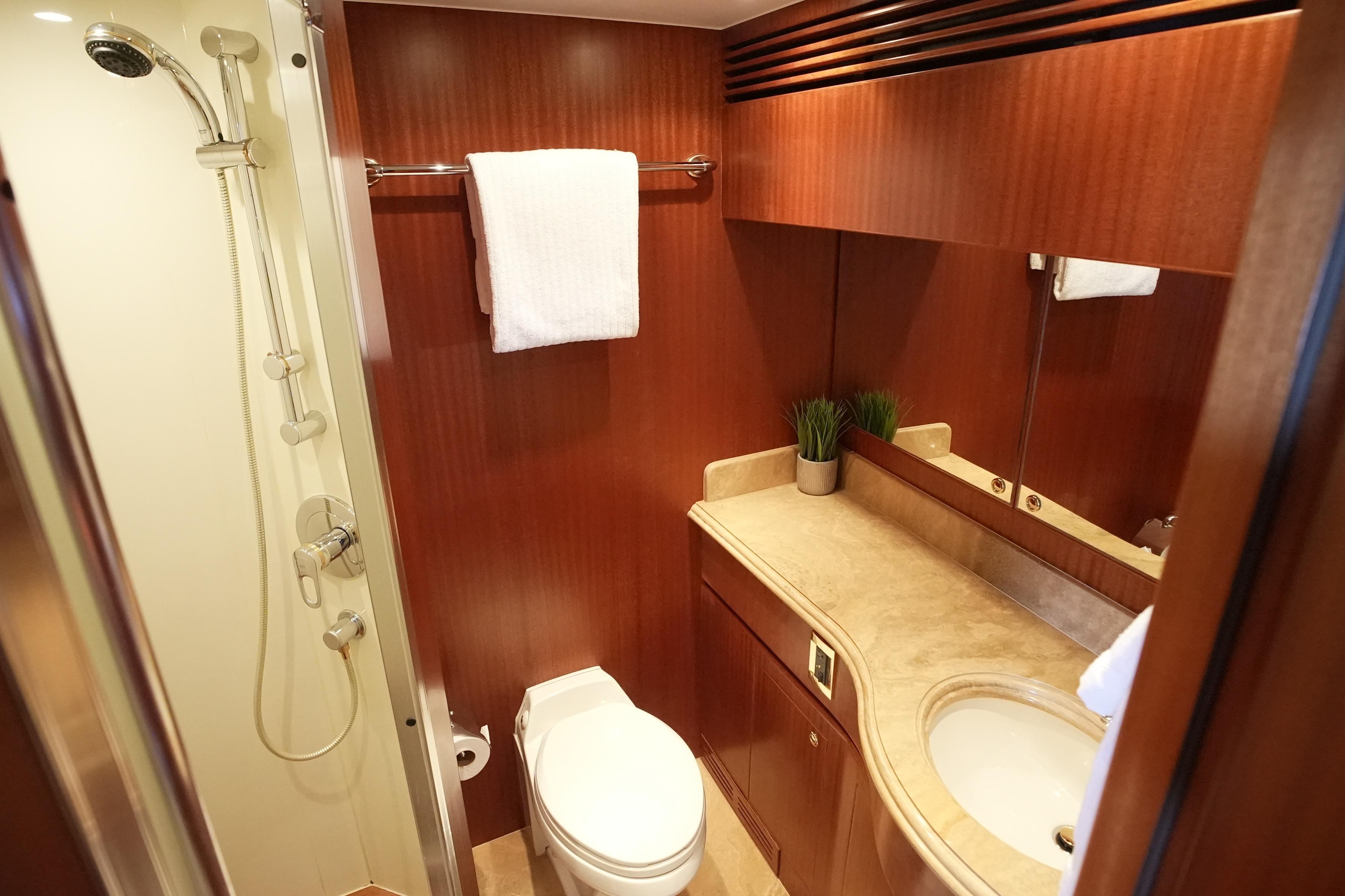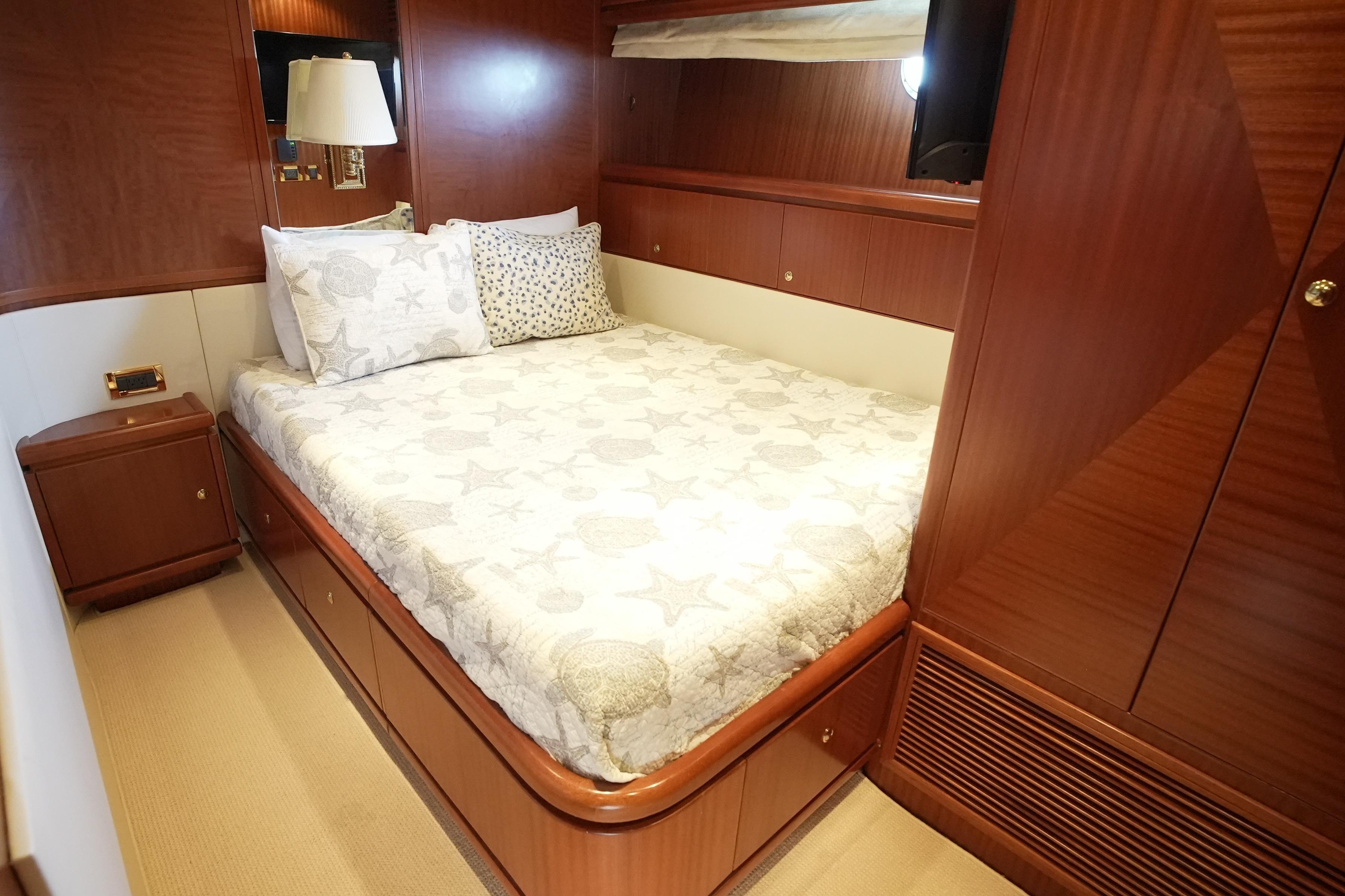 Continuing forward down the foyer, the well-appointed VIP stateroom awaits. A queen size bed, centered in the room and fitted with plush fabrics, ensures your most important guests feel right at home.