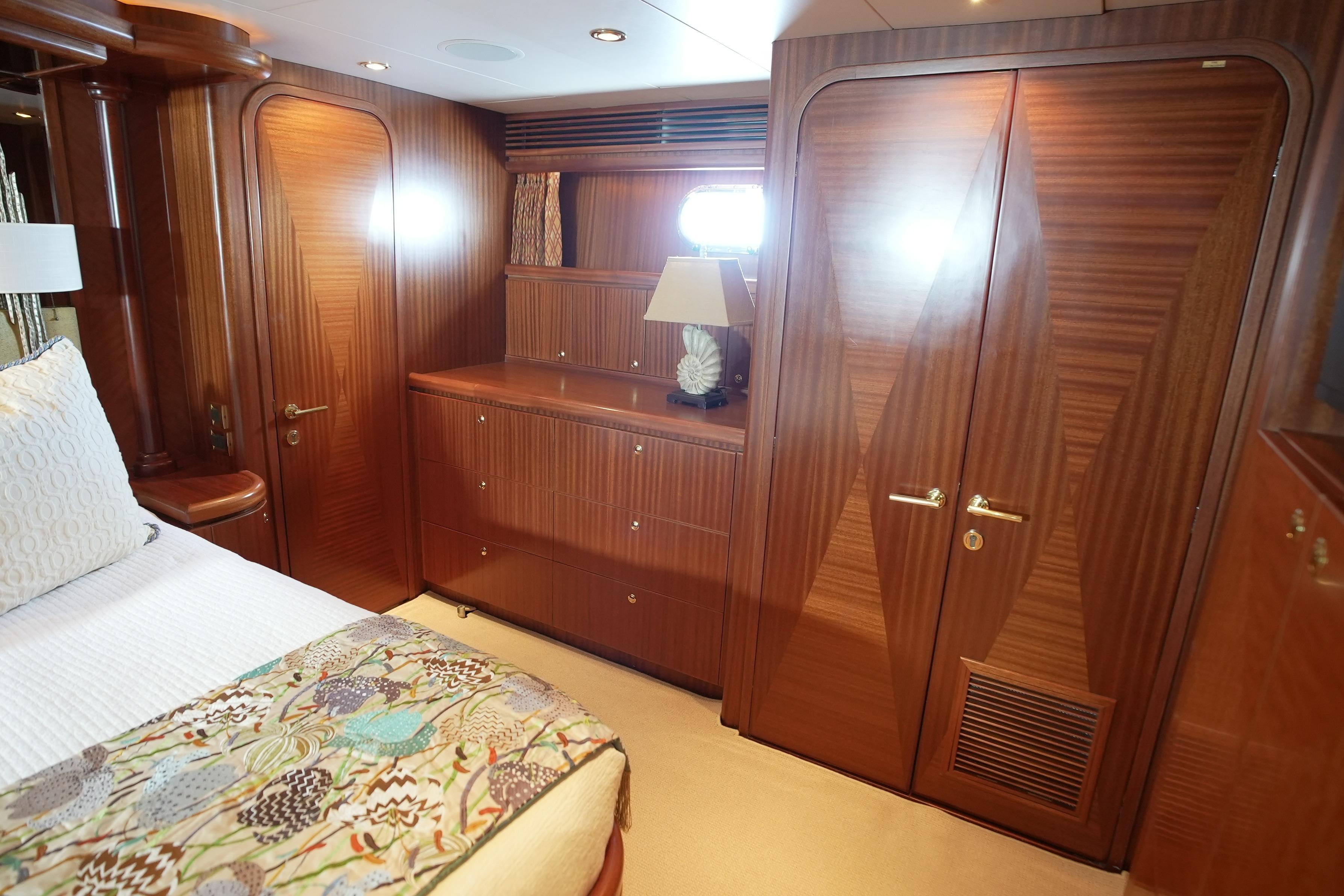 - To starboard, his and her walk-in closets are accompanied by a full set of storage drawers, while several surfaces display wood finished with a diamond-shaped cross grain pattern that brings the space to life.