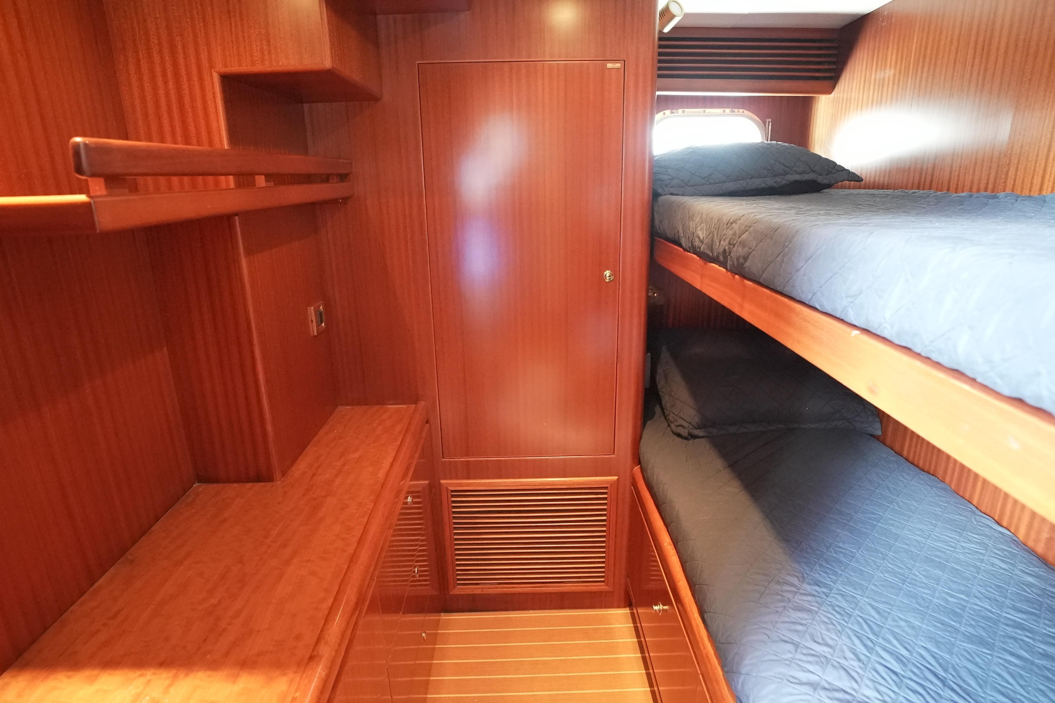 Located to port and starboard are two guest staterooms, each with twin beds that accommodate four guests in total.